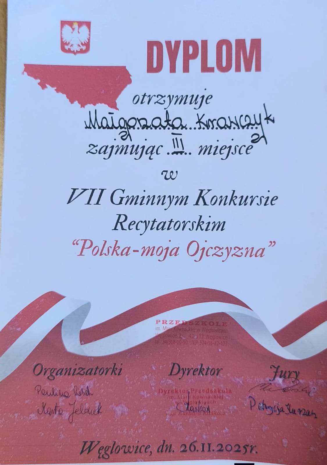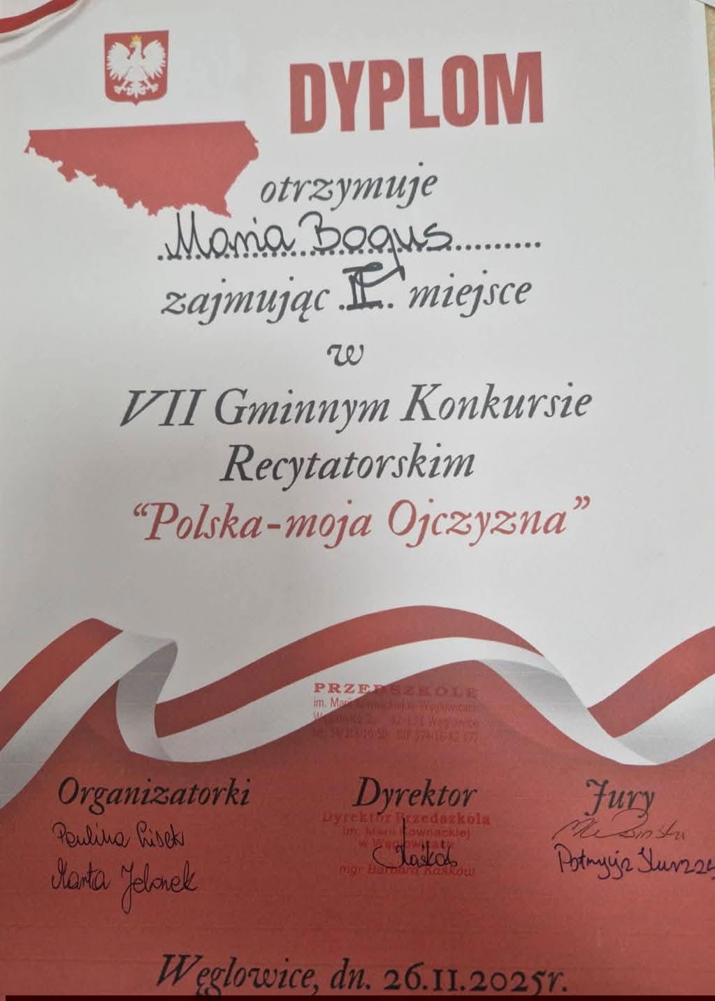 * VII Gminnym Konkursie Recytatorskim "Polska-Moja Ojczyzna" organizowanym przez Przedszkole w Węglowicach: