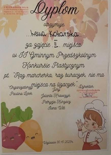 * II Gminnym Konkursie Plastycznym "Raz marchewka, raz buraczek, nie ma miejsca na lizaczek" organizowaym przez Przedszkole w Węglowicach: