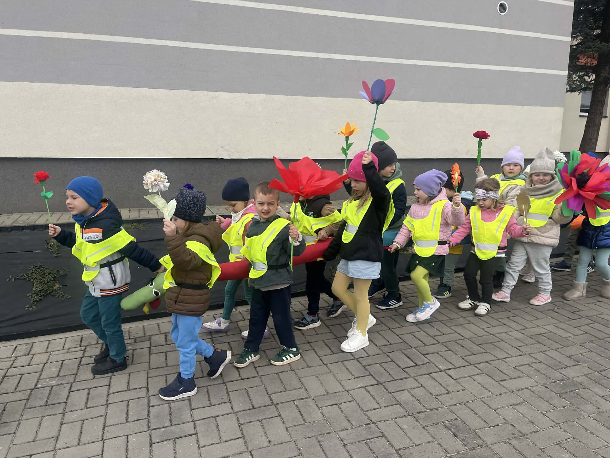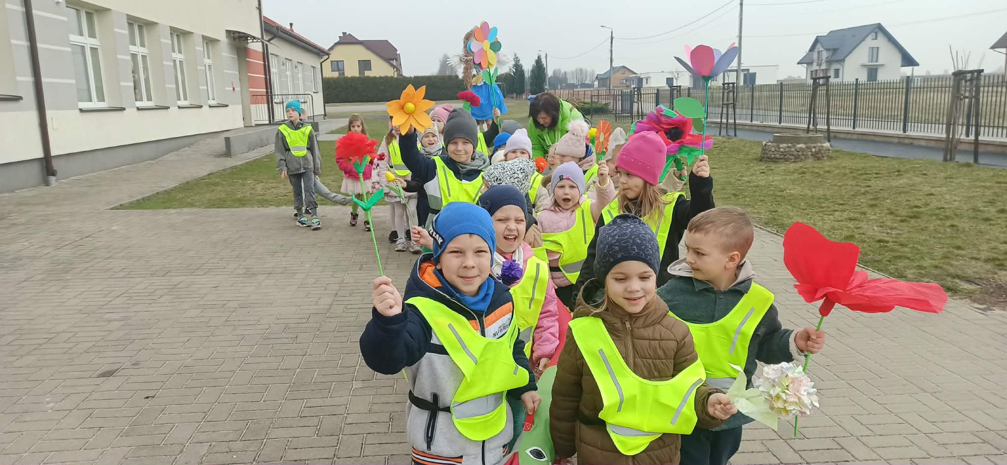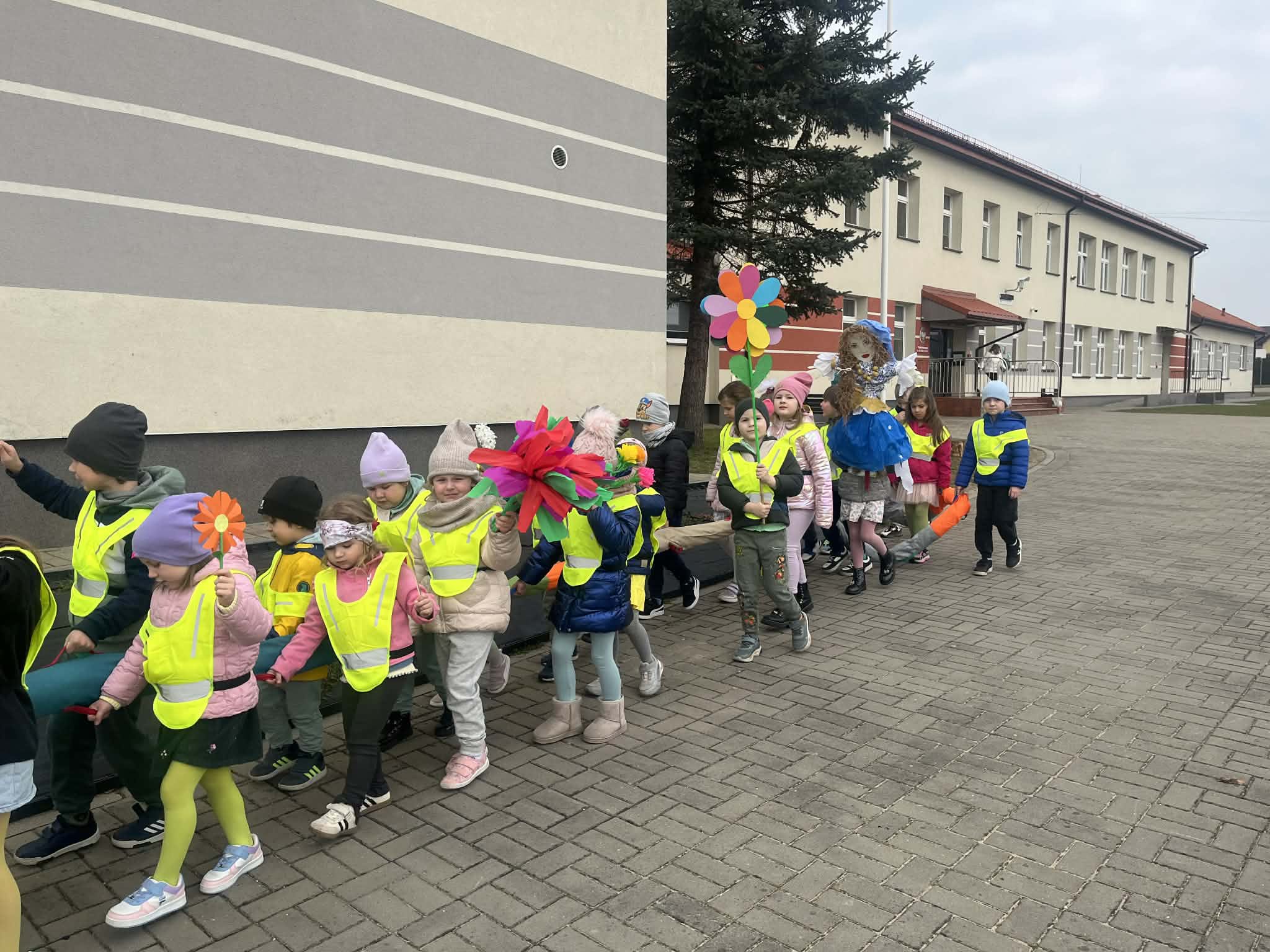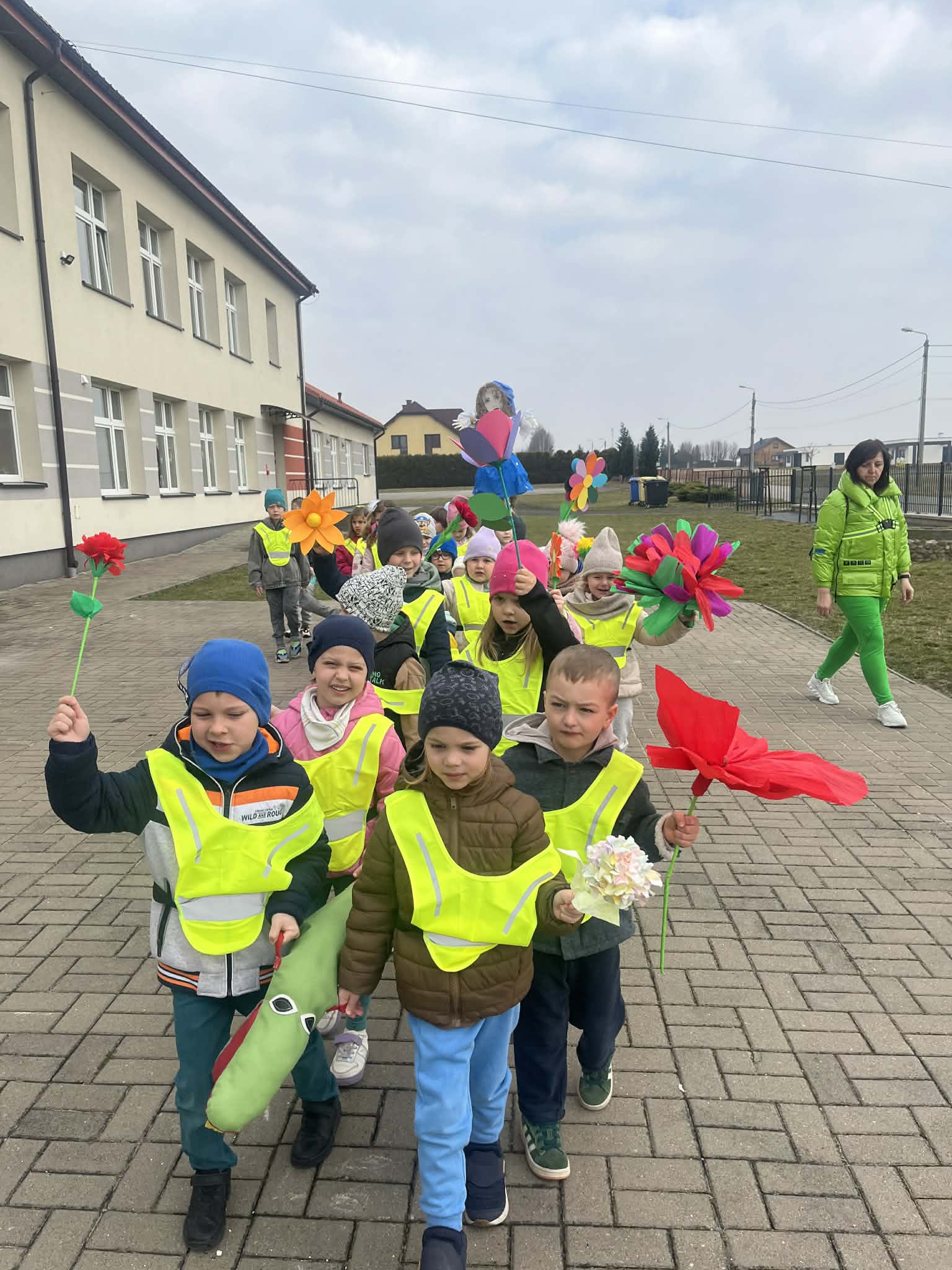 Przedszkolaki witały Panią Wiosnę w barwnym korowodzie, który przeszedł ulicami naszej miejscowości. Podczas marszu dzieci śpiewały wiosenne piosenki i machały kolorowymi kwiatami. Po powrocie do szkoły wzięliśmy udział w części artystycznej przygotowanej przez społeczność szkolną.