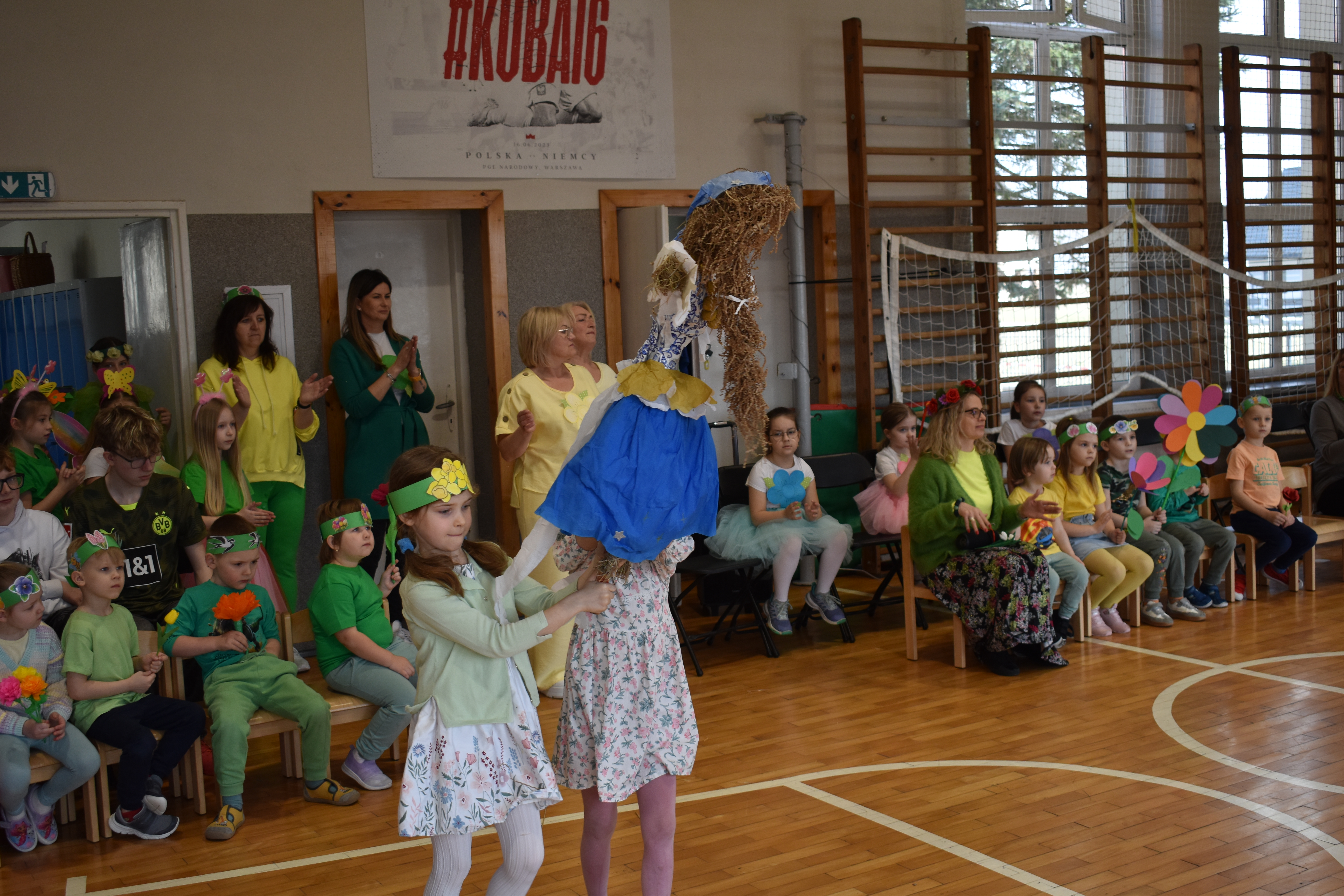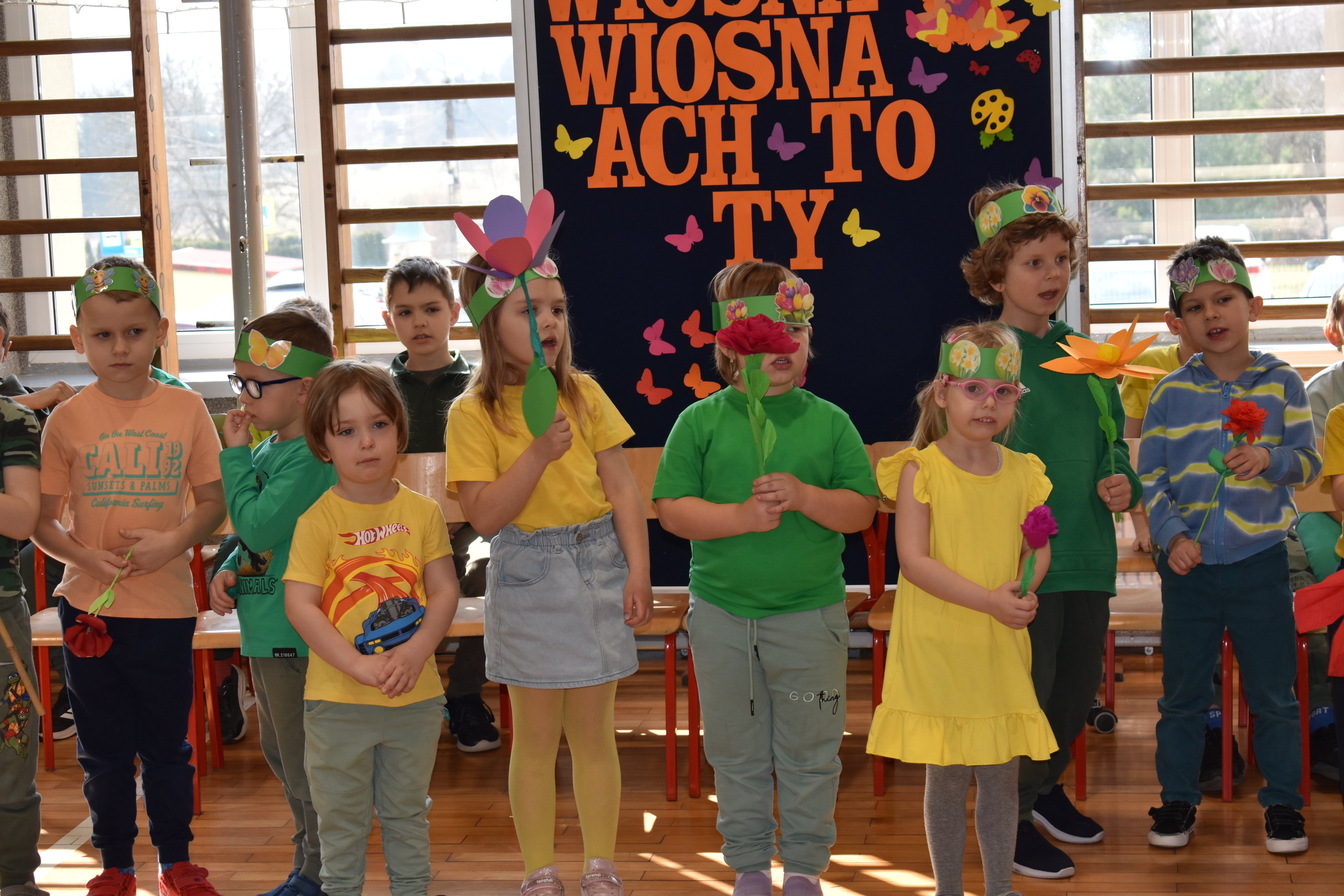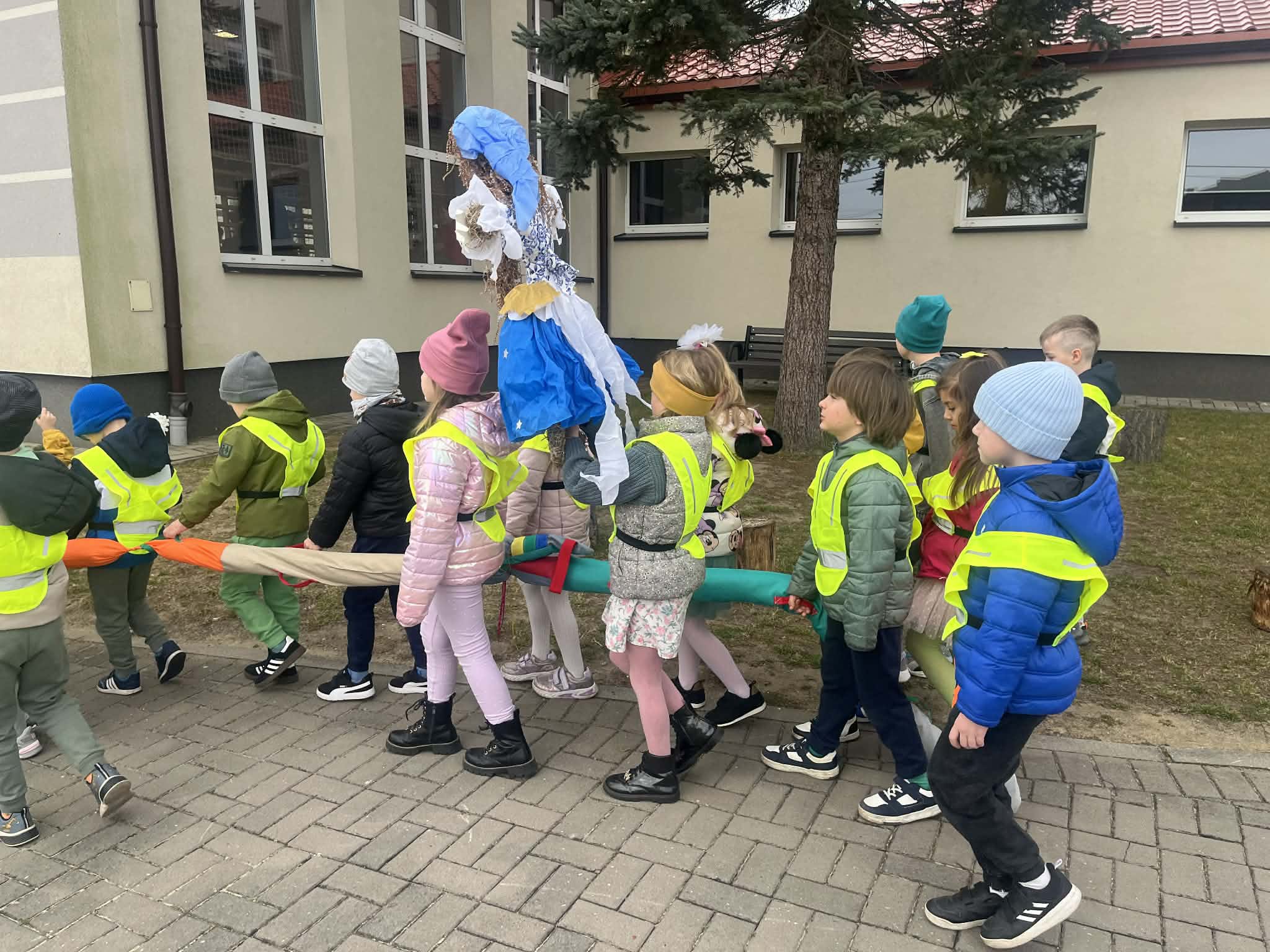 Przedszkolaki witały Panią Wiosnę w barwnym korowodzie, który przeszedł ulicami naszej miejscowości. Podczas marszu dzieci śpiewały wiosenne piosenki i machały kolorowymi kwiatami. Po powrocie do szkoły wzięliśmy udział w części artystycznej przygotowanej przez społeczność szkolną.