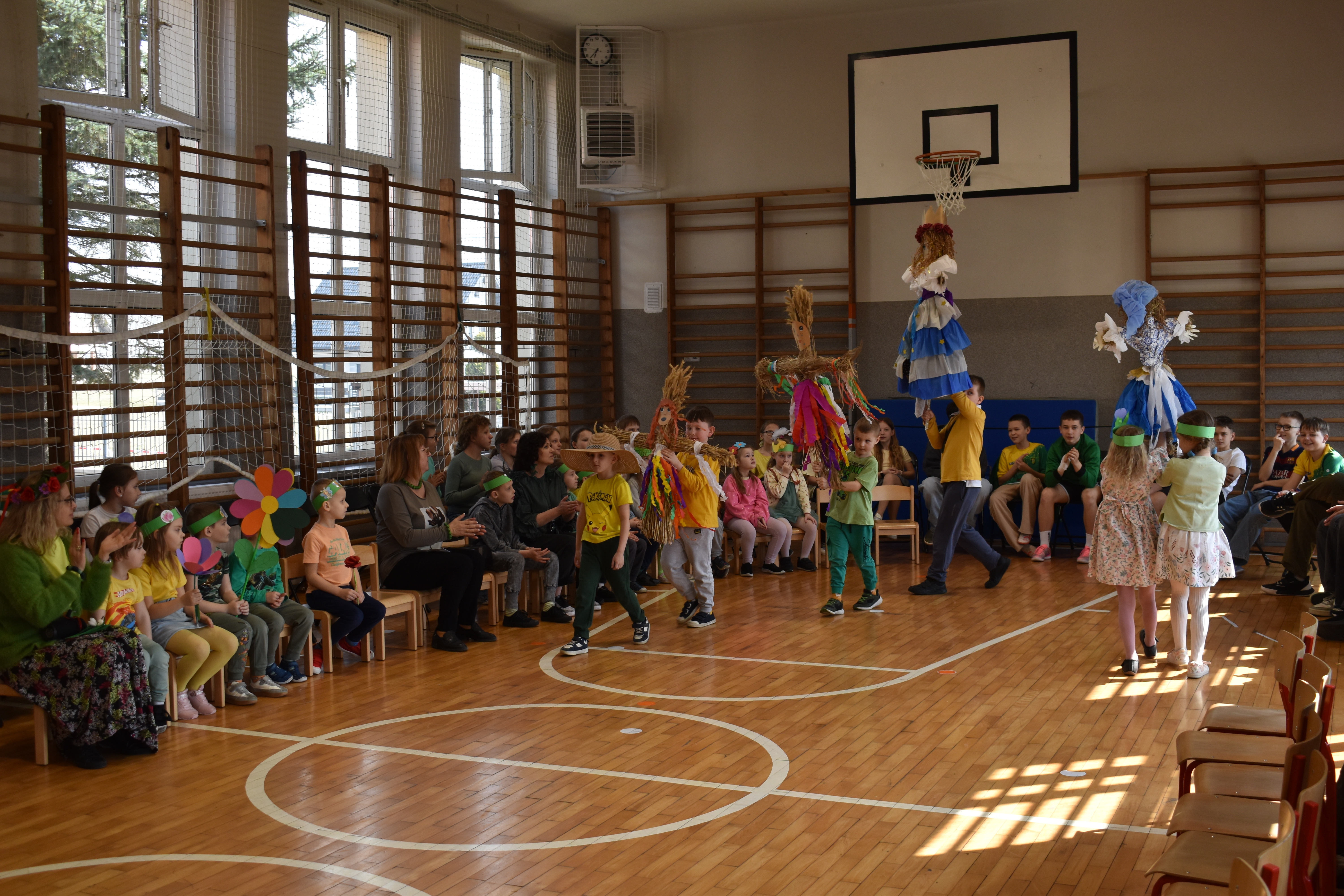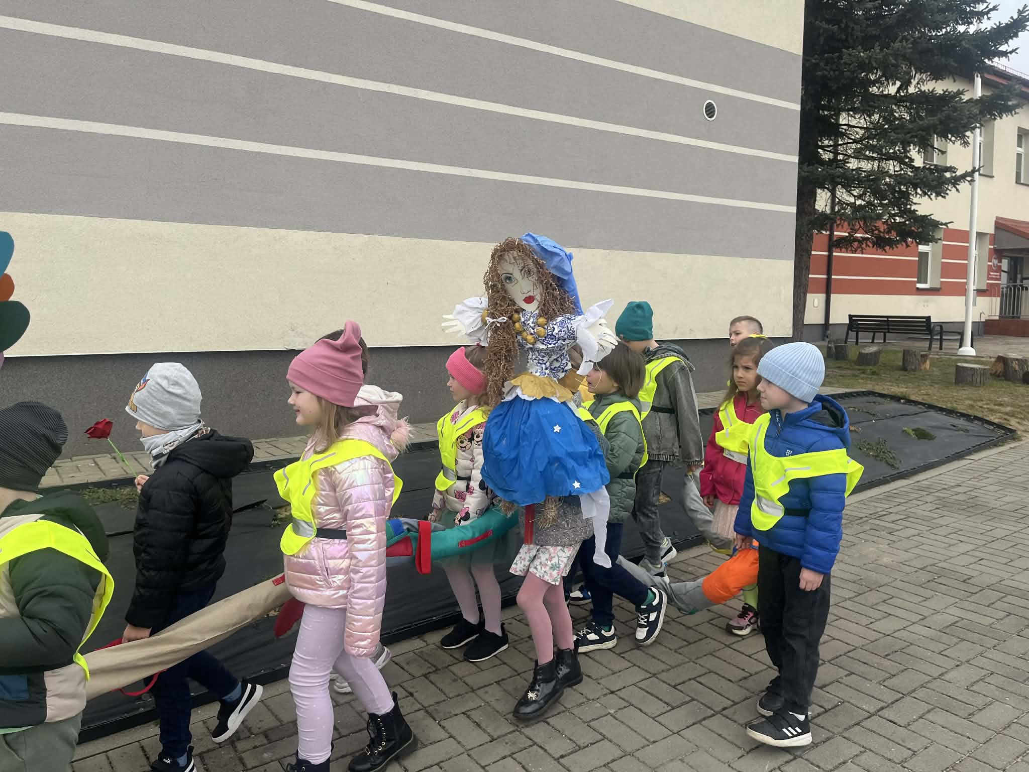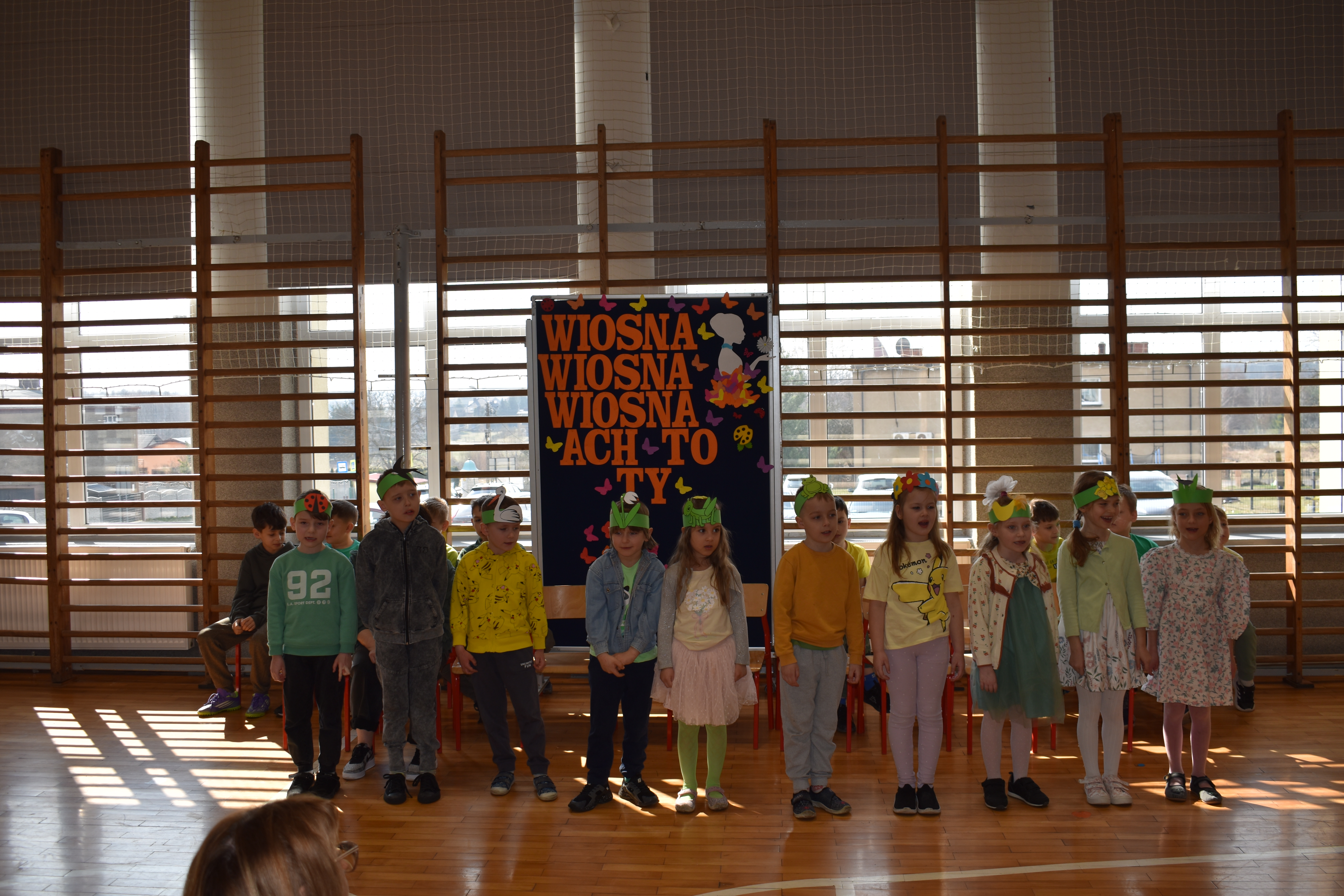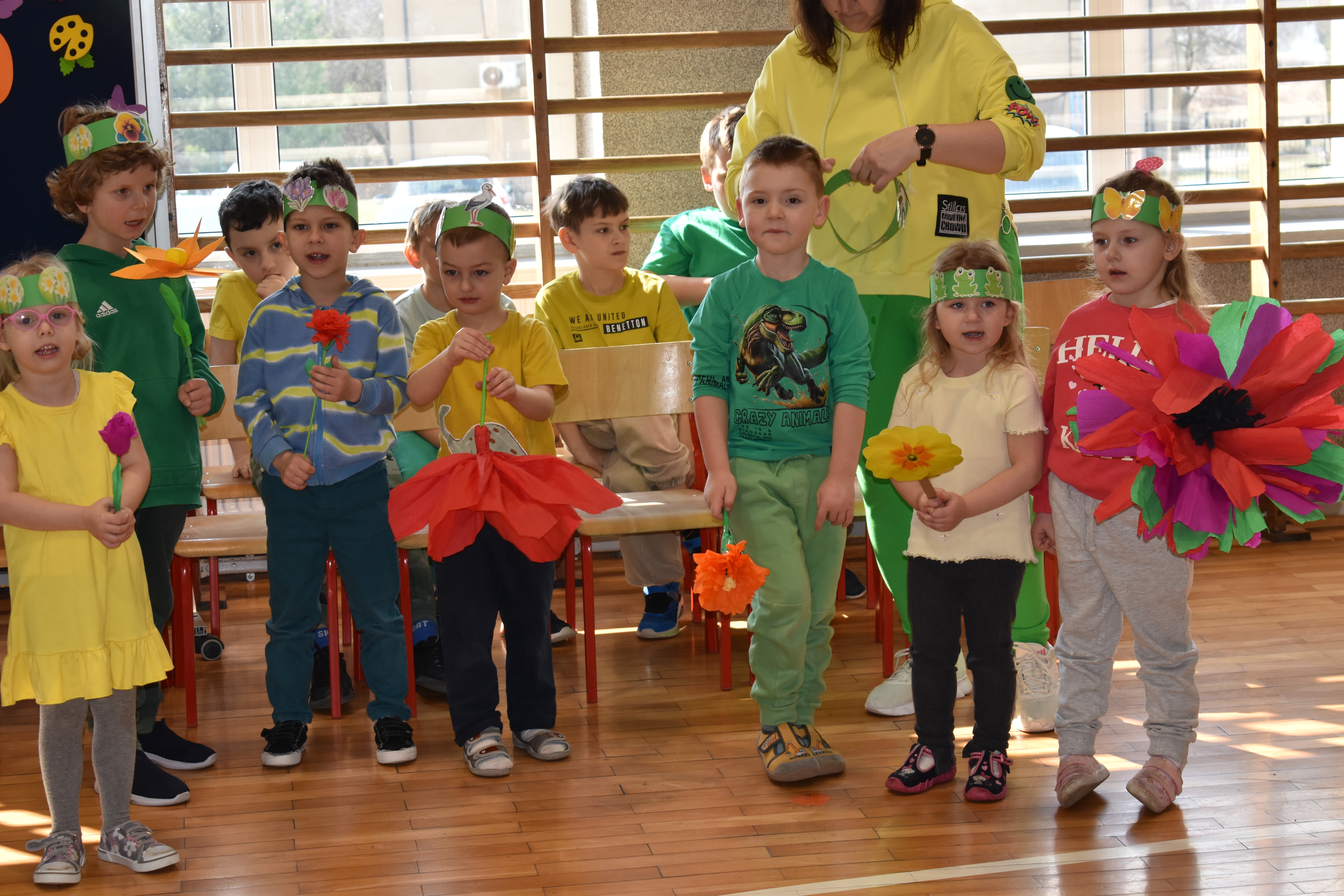 Przedszkolaki witały Panią Wiosnę w barwnym korowodzie, który przeszedł ulicami naszej miejscowości. Podczas marszu dzieci śpiewały wiosenne piosenki i machały kolorowymi kwiatami. Po powrocie do szkoły wzięliśmy udział w części artystycznej przygotowanej przez społeczność szkolną.