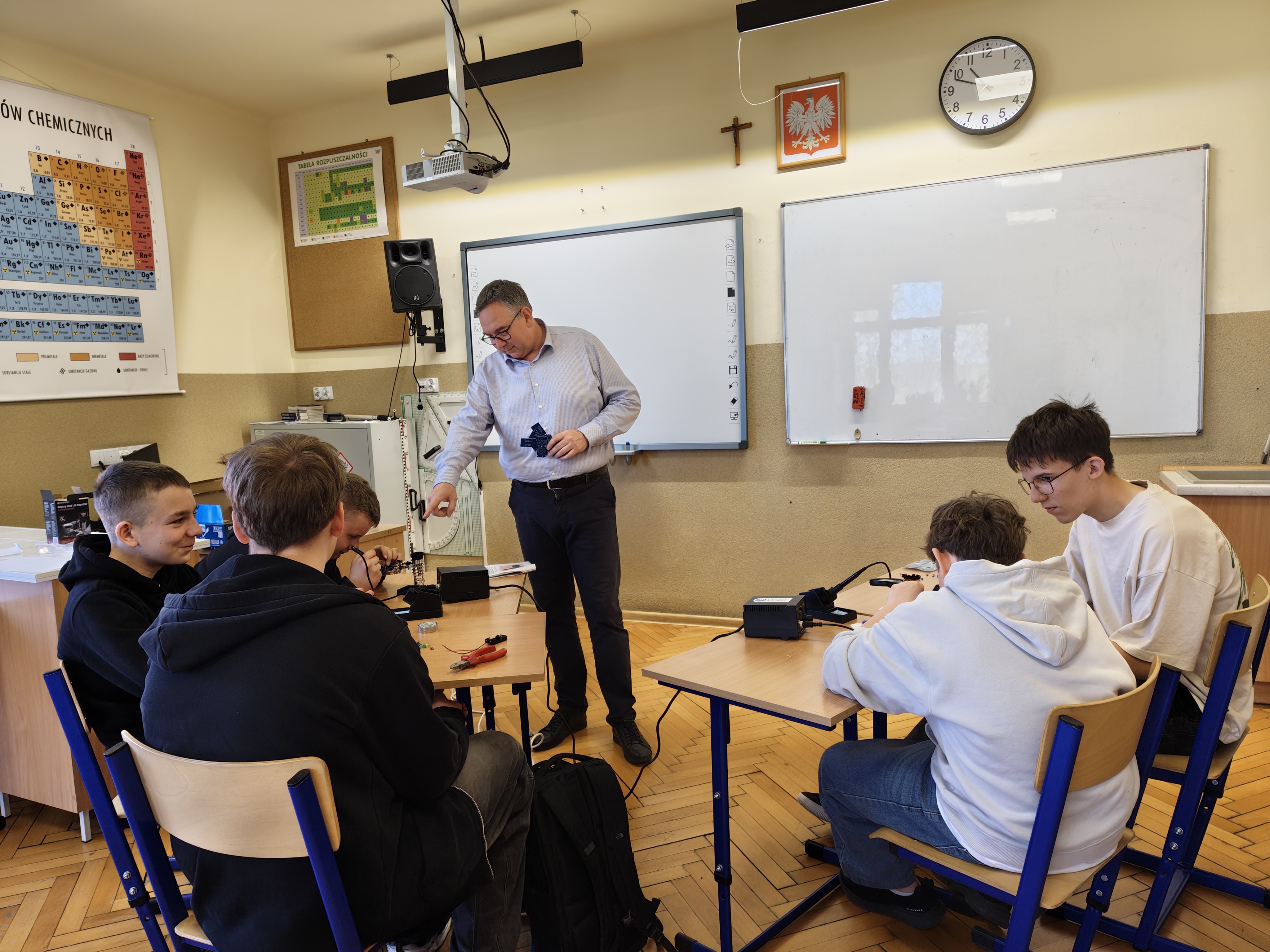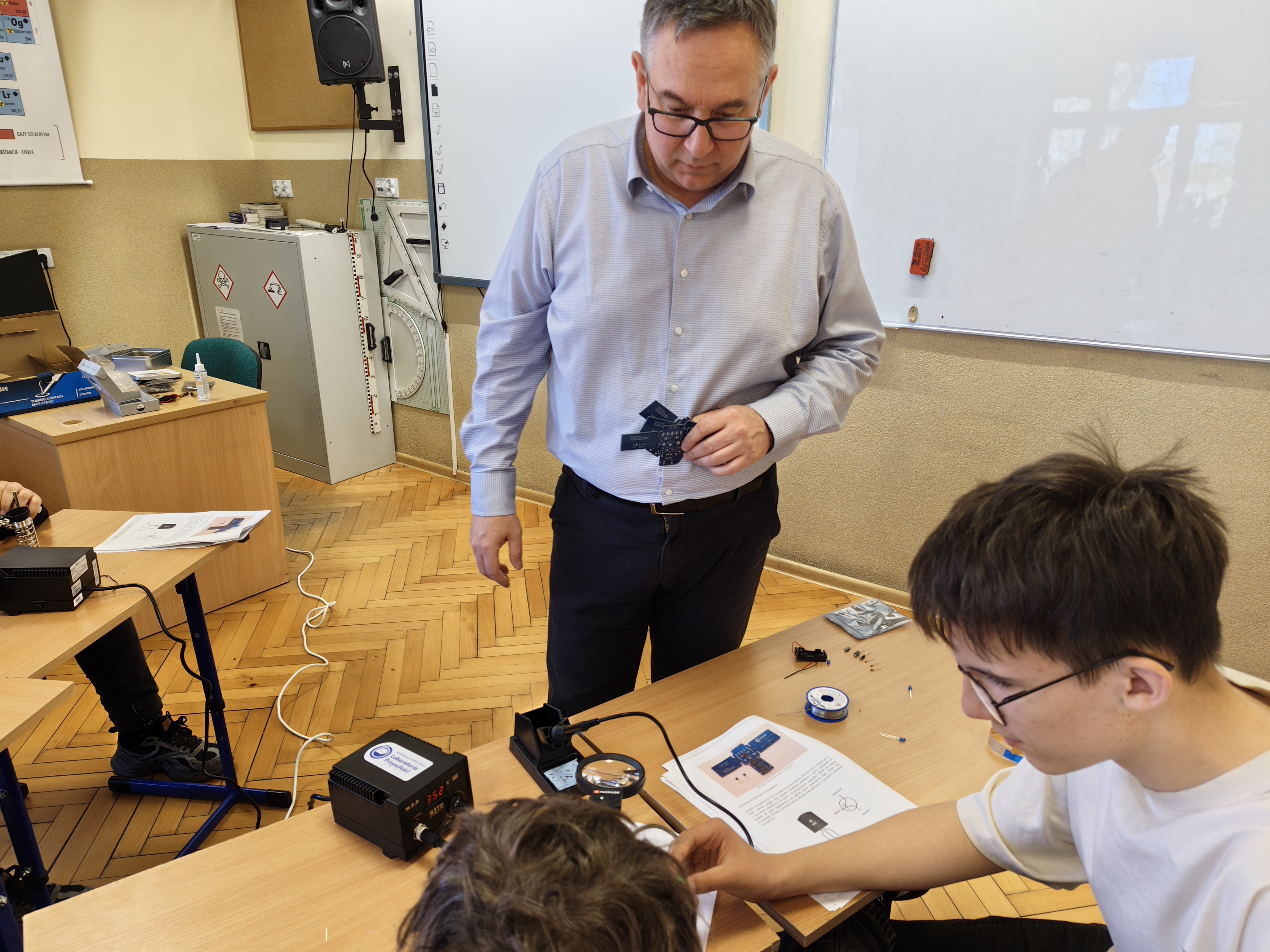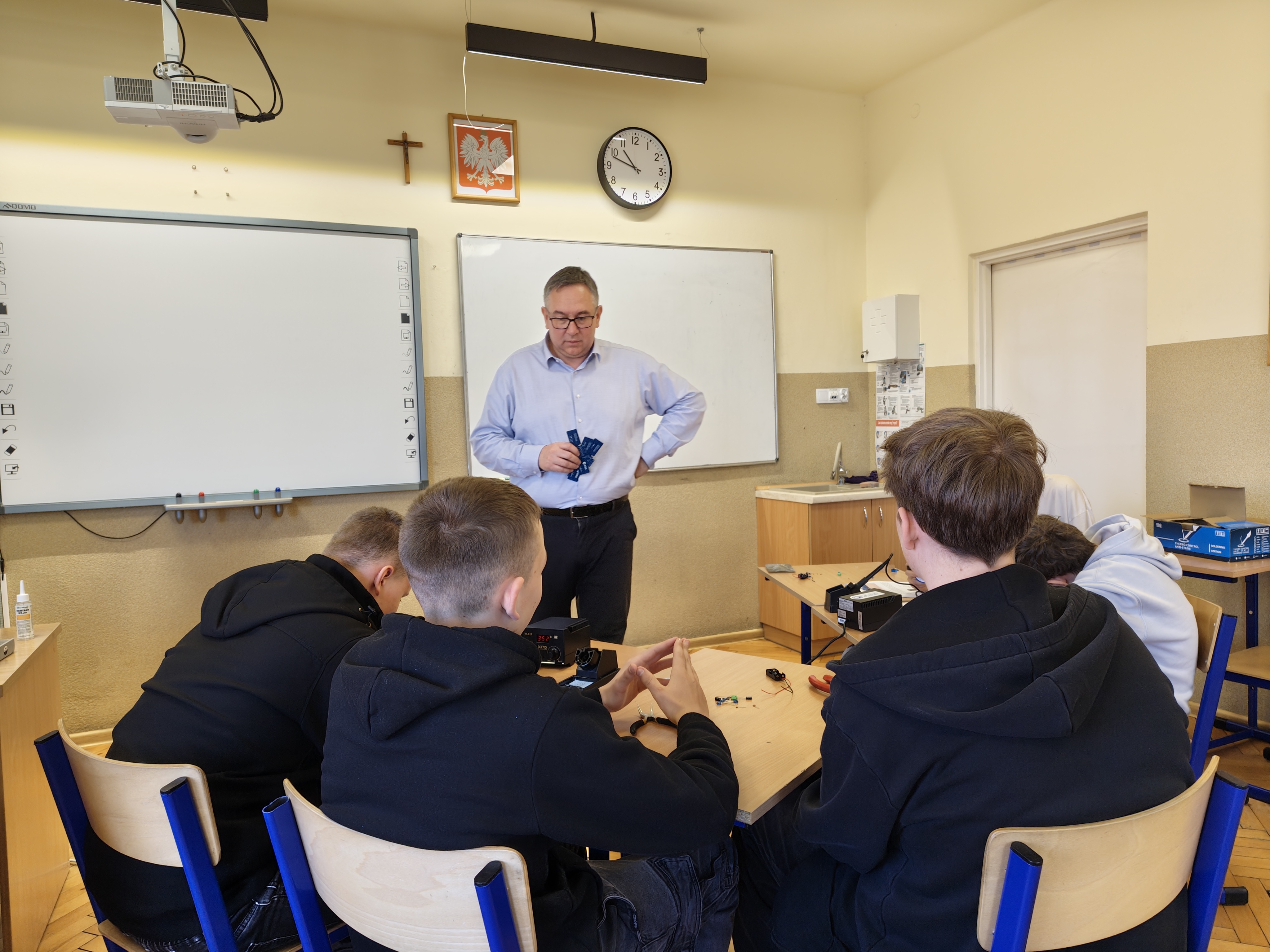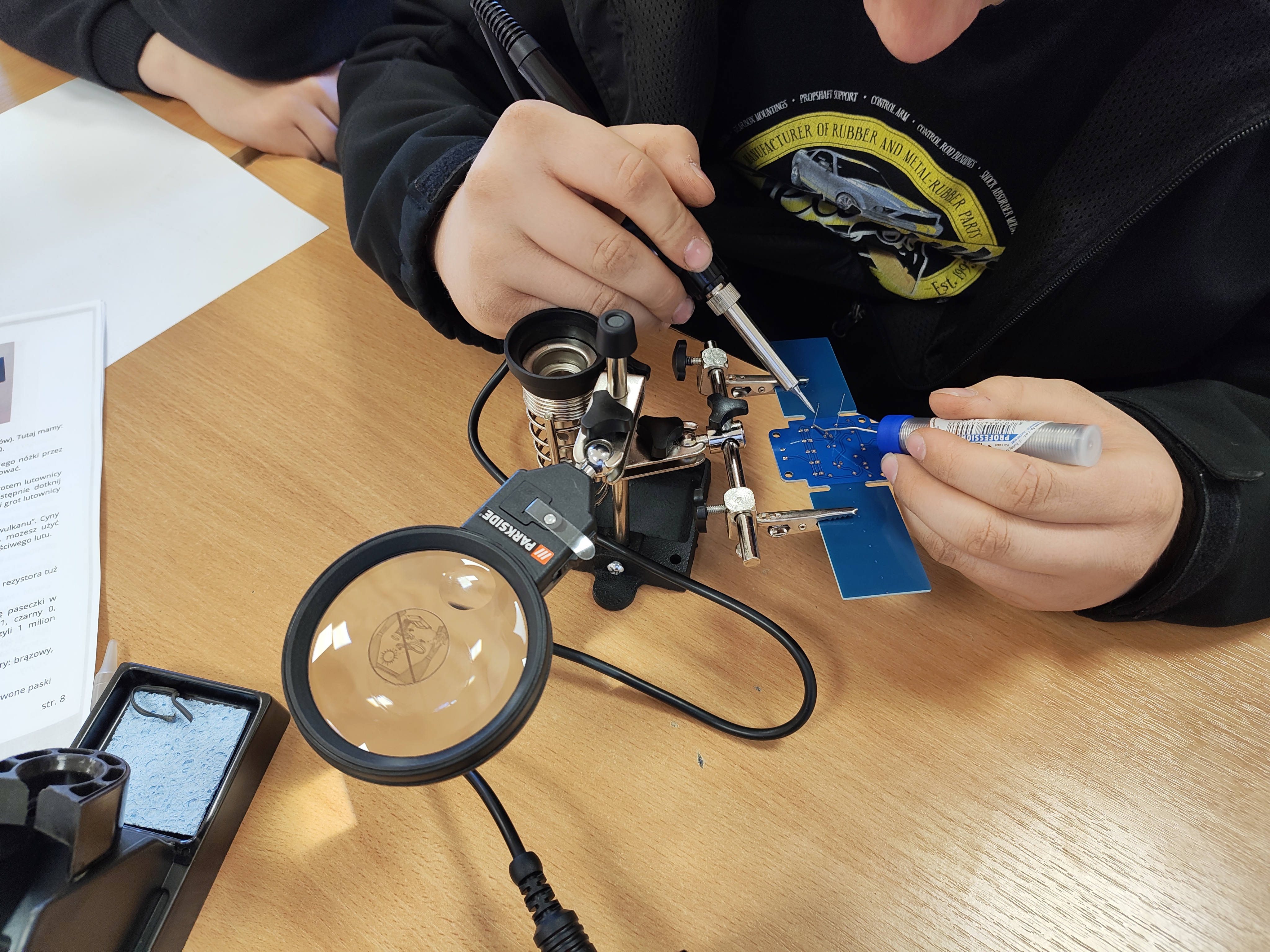 Zajęcia rozpoczęły się od szczegółowego zapoznania z celem projektu oraz planem jego realizacji. Uczniowie poznali budowę i działanie płytki PCB (Printed Circuit Board), czyli charakterystykę układu elektronicznego, a także zastosowanie poszczególnych komponentów.