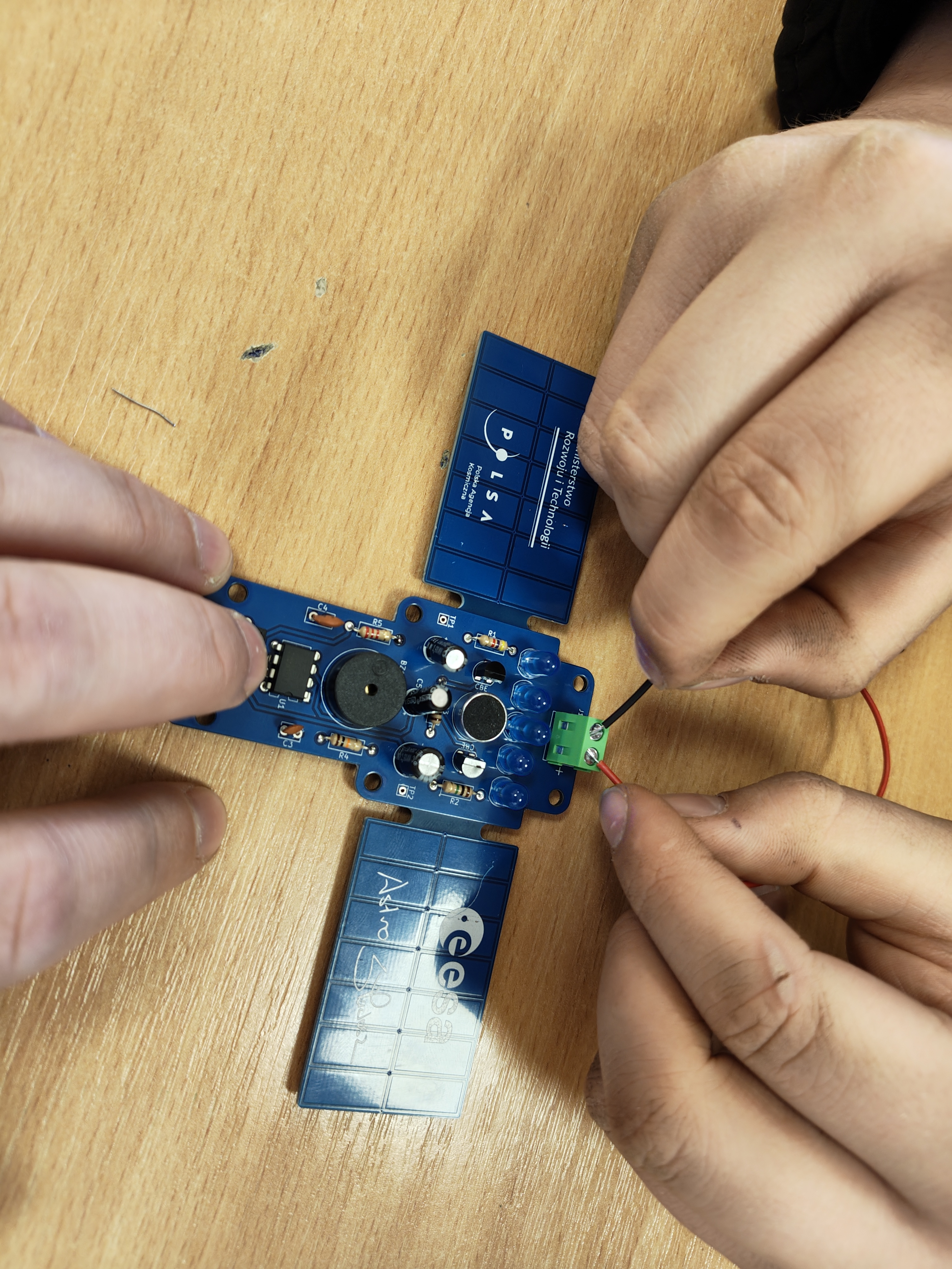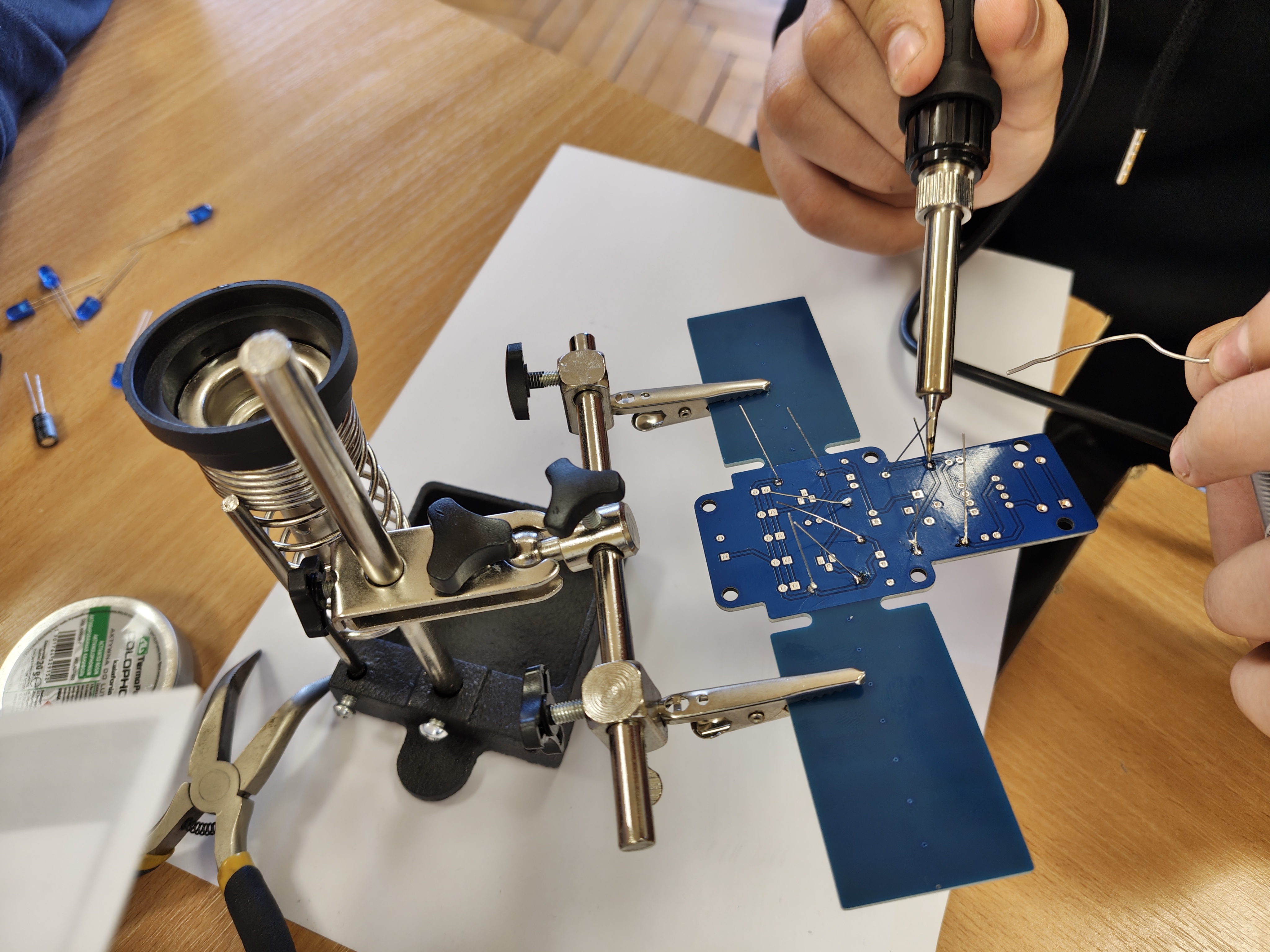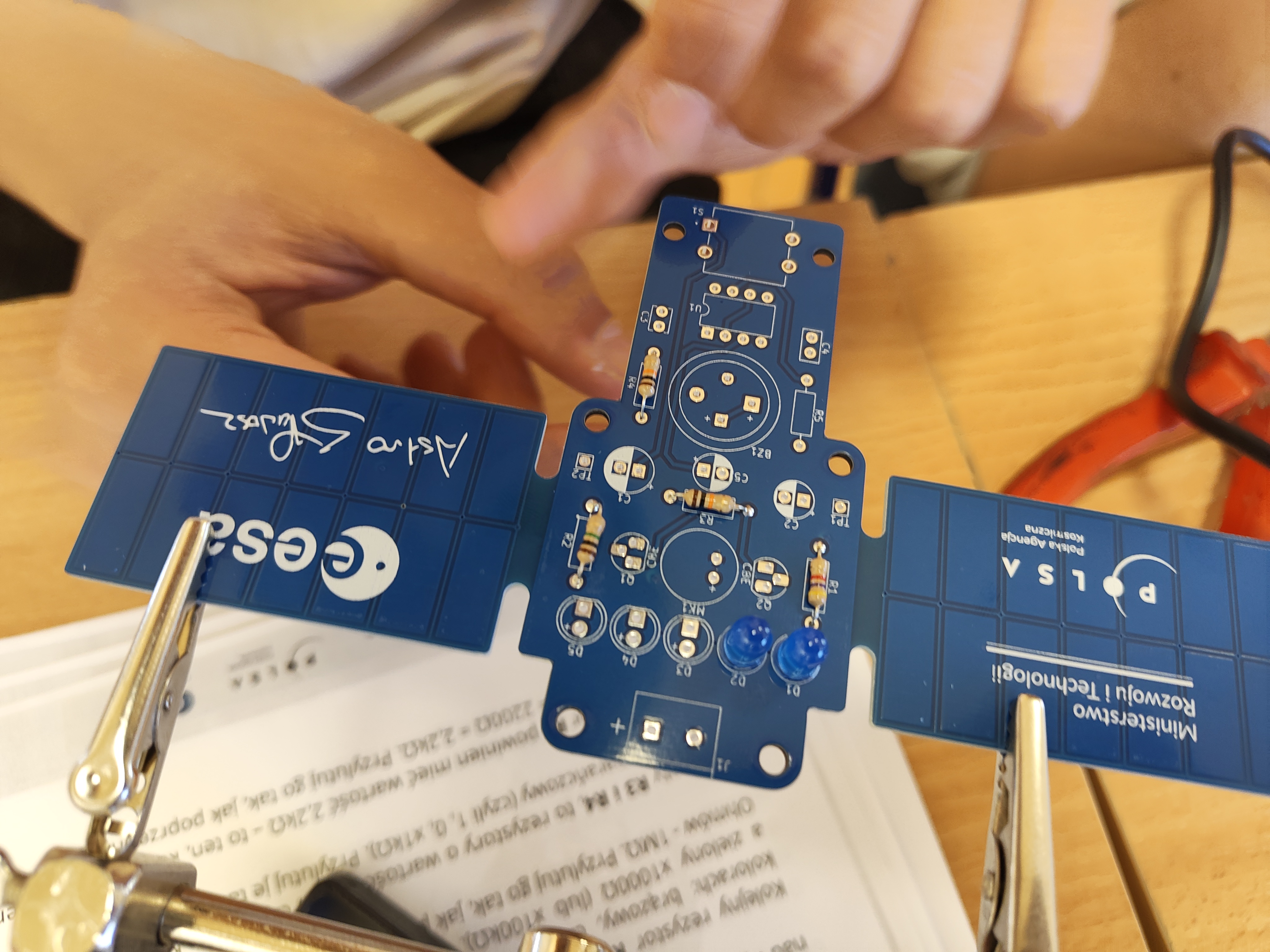 Kluczowym etapem było złożenie elementów elektronicznych: uczniowie zamontowali 5 diod LED półprzewodnikowych, 9 rezystorów, 6 różnych kondensatorów, 2 tranzystory, układ scalony, brzęczyk, mikrofon, złącze terminalowe, koszyk na dwie baterie typu AAA oraz dystanse (nóżki) do stabilizacji konstrukcji.