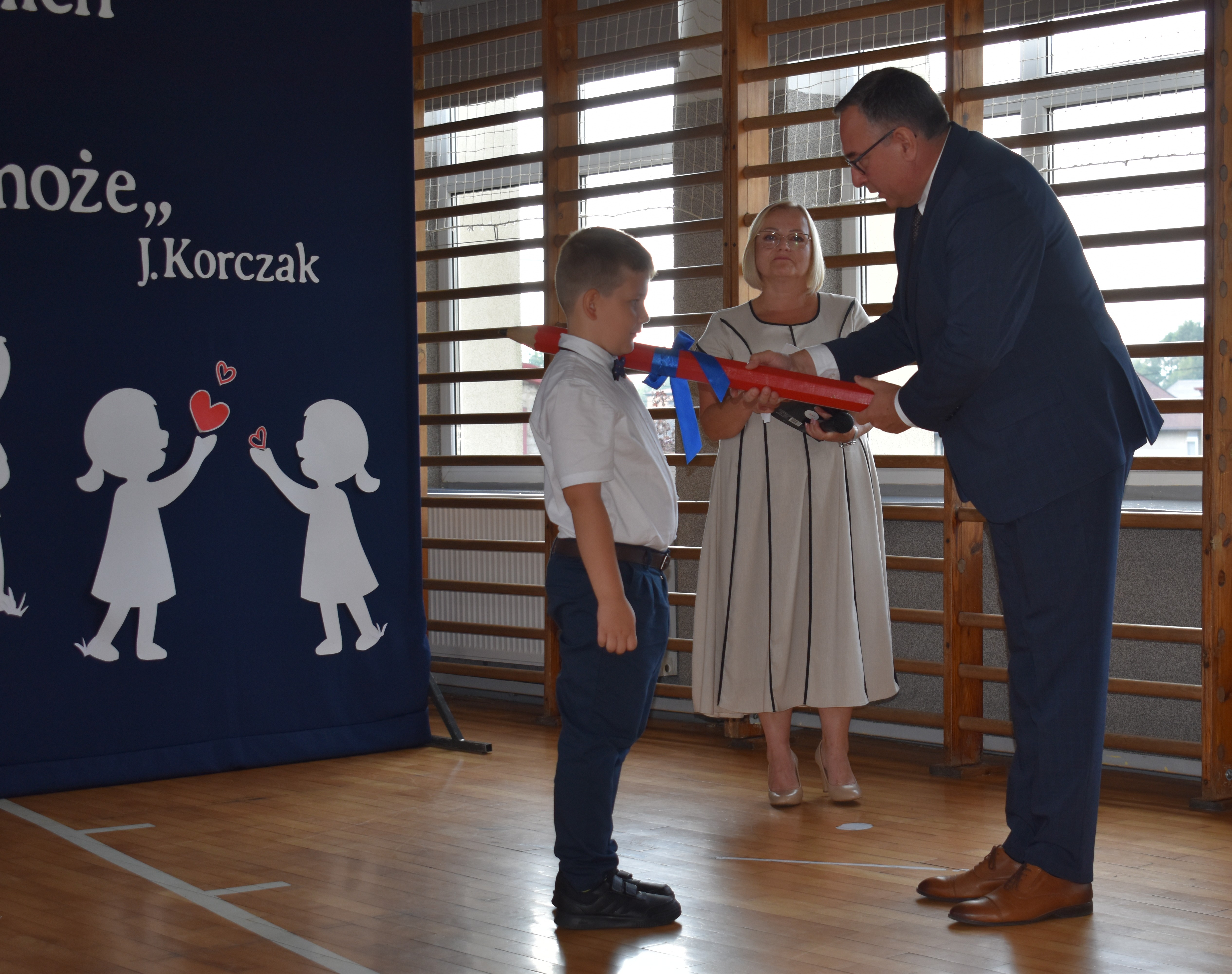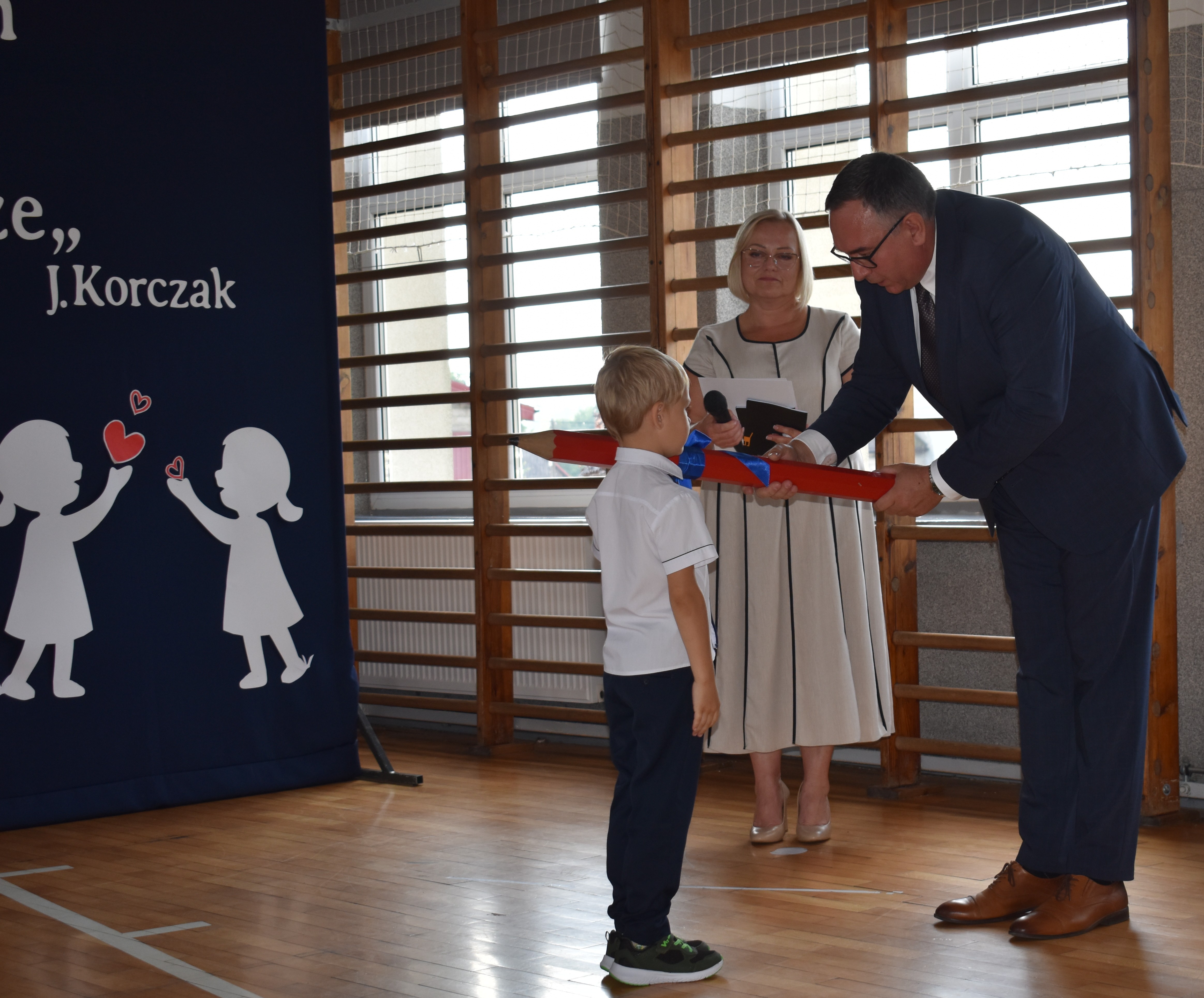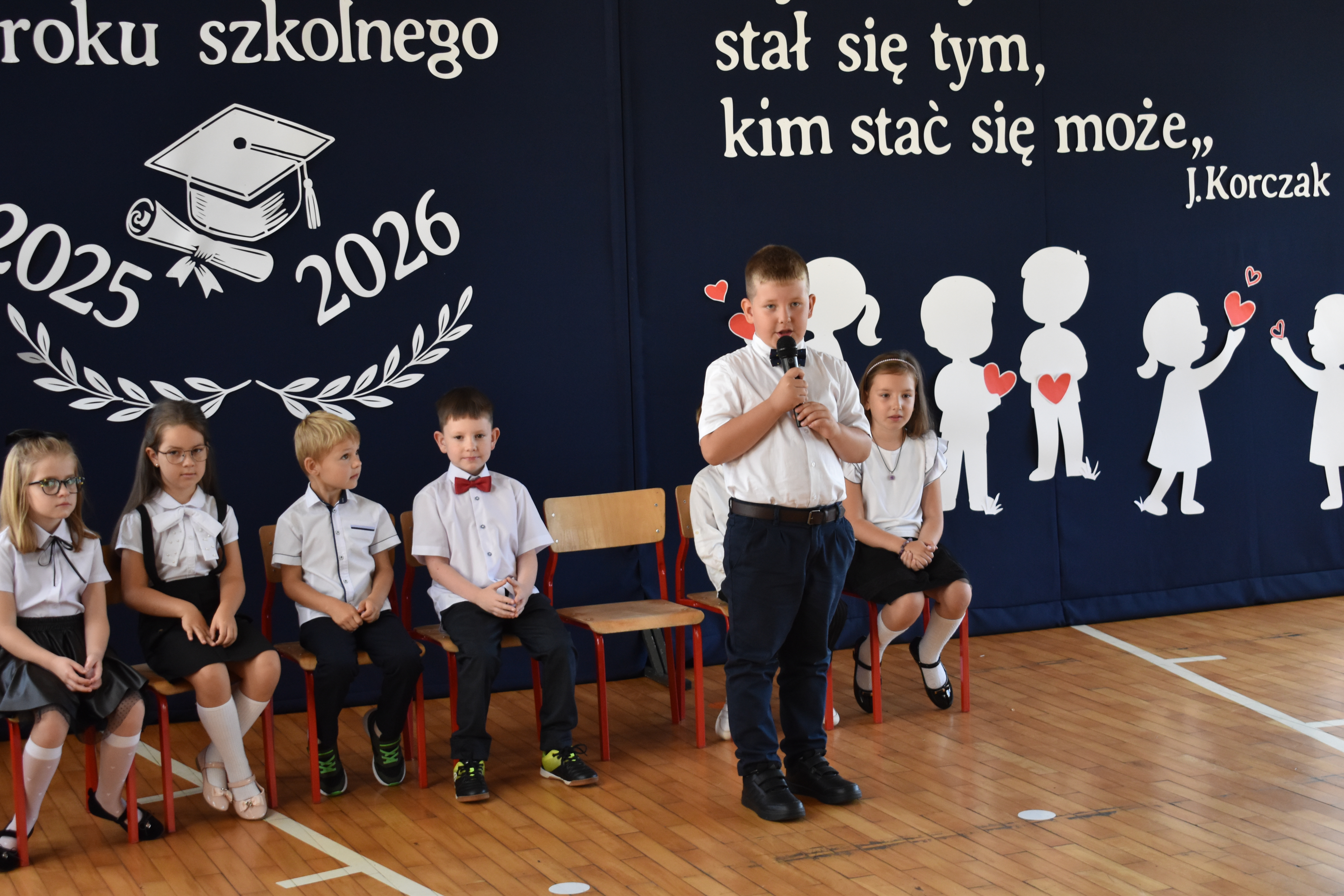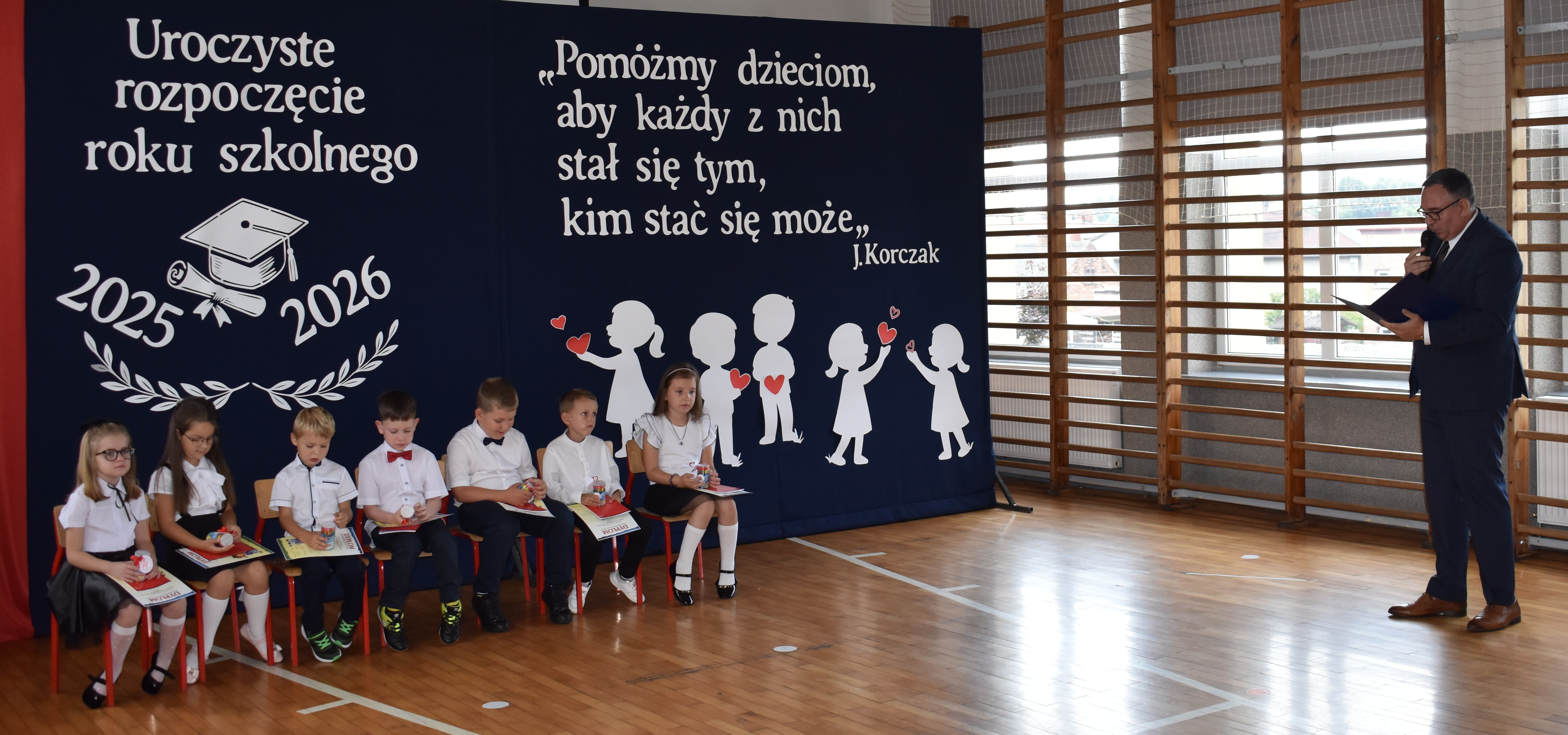 Szczególnie ciepłe słowa skierowane zostały do uczniów klasy pierwszej, którzy po raz pierwszy przekroczyli próg szkoły. W ich życiu rozpoczął się nowy, ważny etap. Z tej okazji odbyła się ceremonia pasowania na ucznia. Pierwszoklasiści, ubrani odświętnie i z lekką tremą, złożyli uroczyste ślubowanie, obiecując być pilnymi, uczciwymi i dobrymi kolegami. Następnie Pan dyrektor wielkim, symbolicznym ołówkiem pasował każde dziecko na ucznia szkoły.
