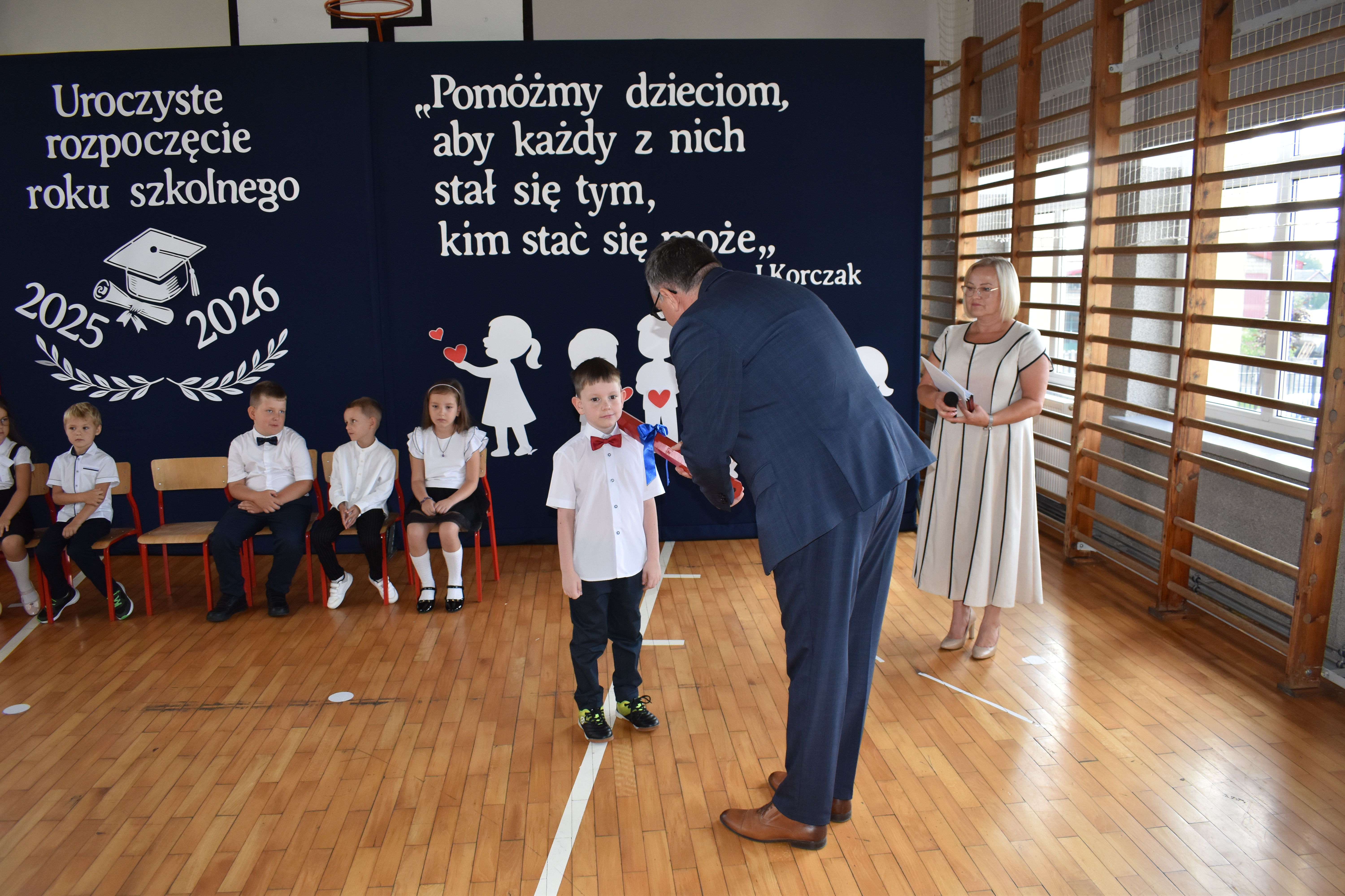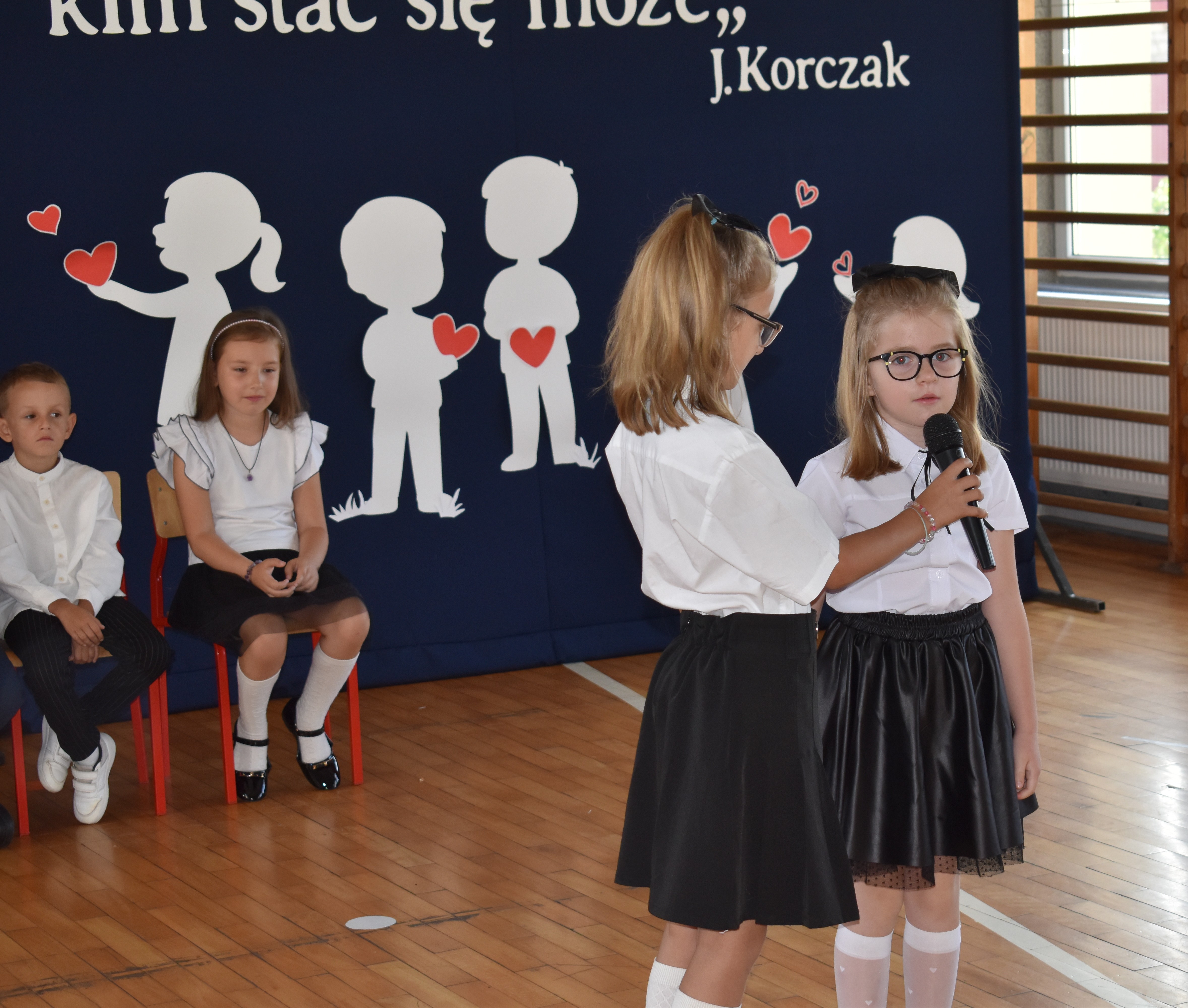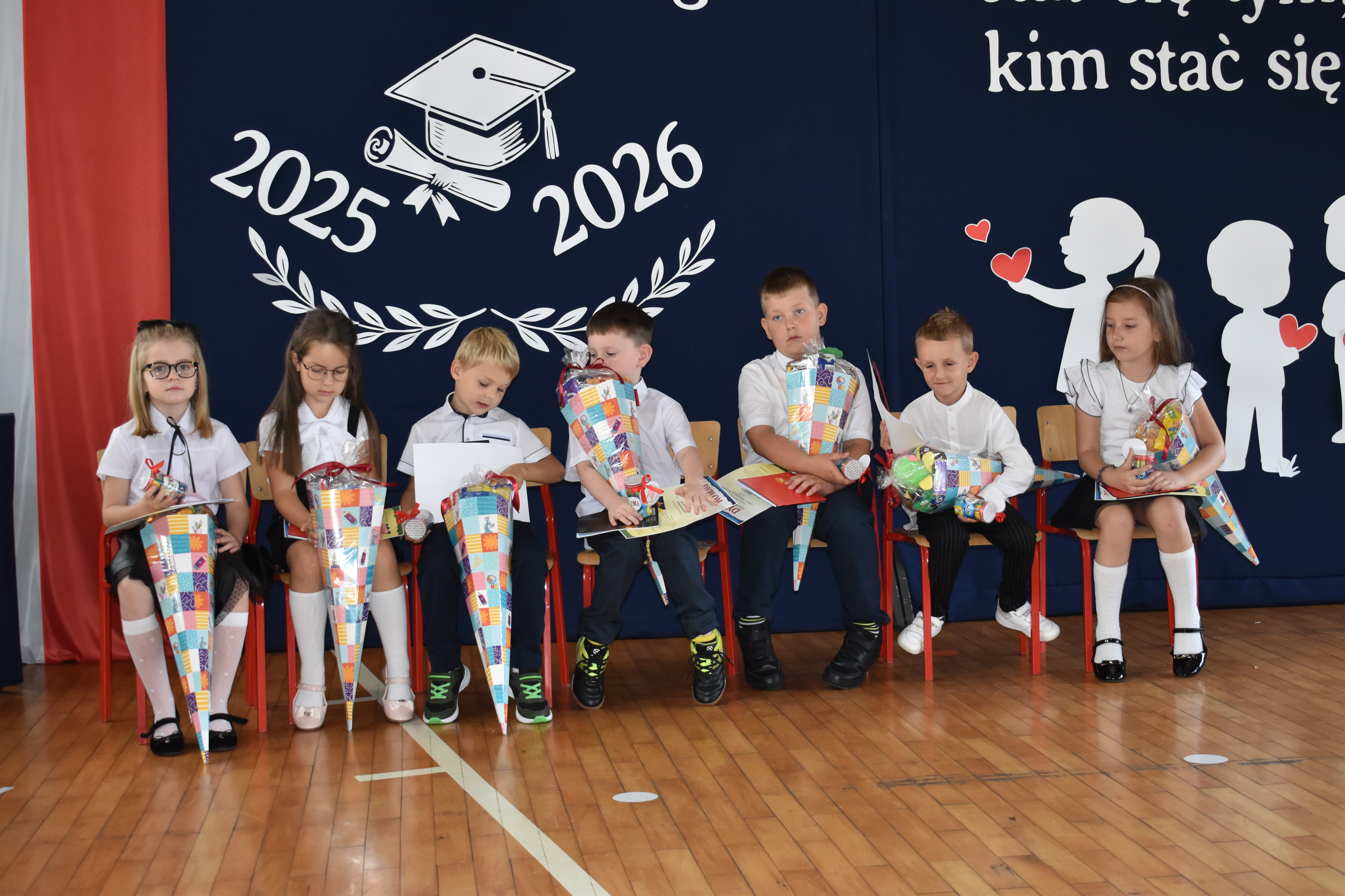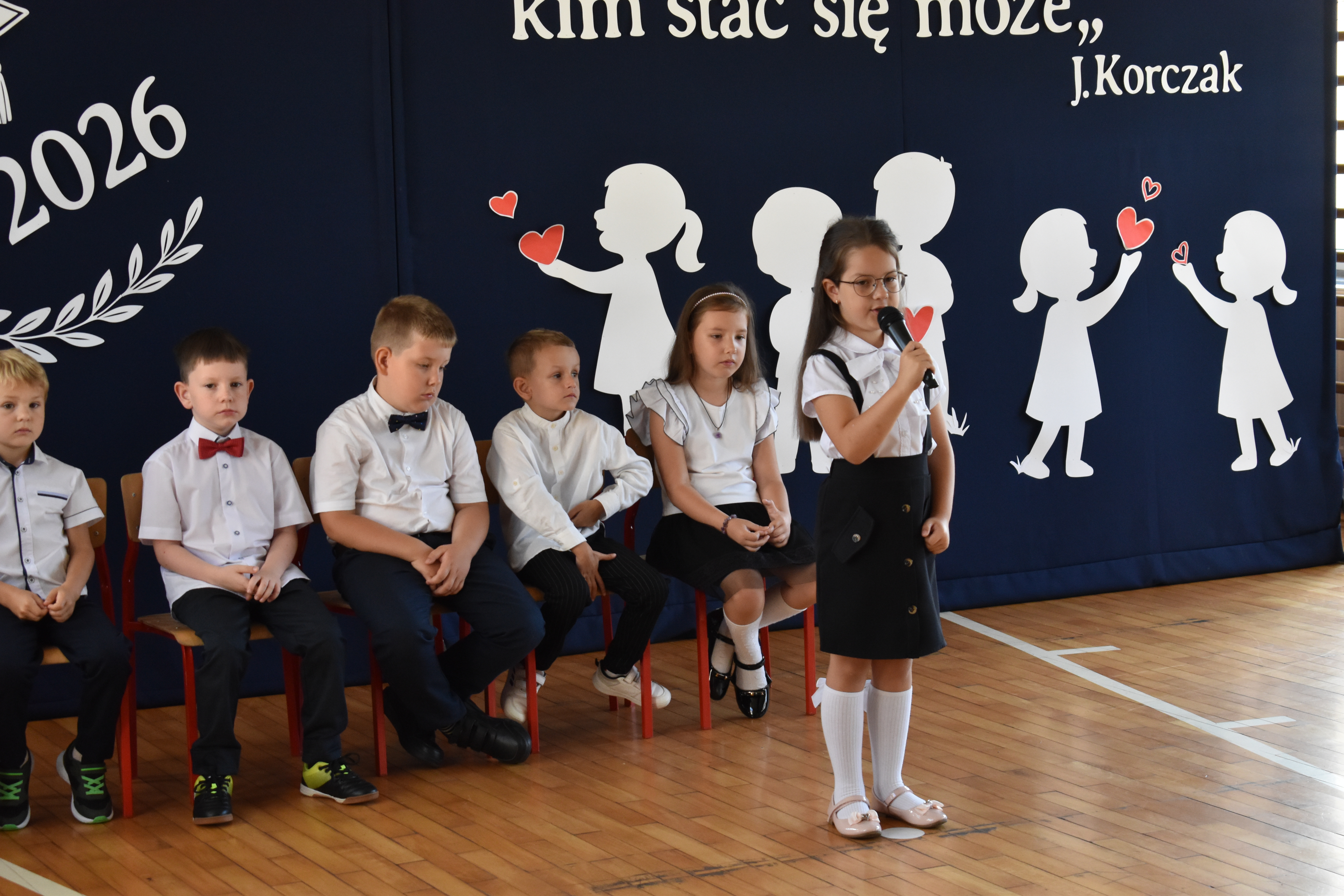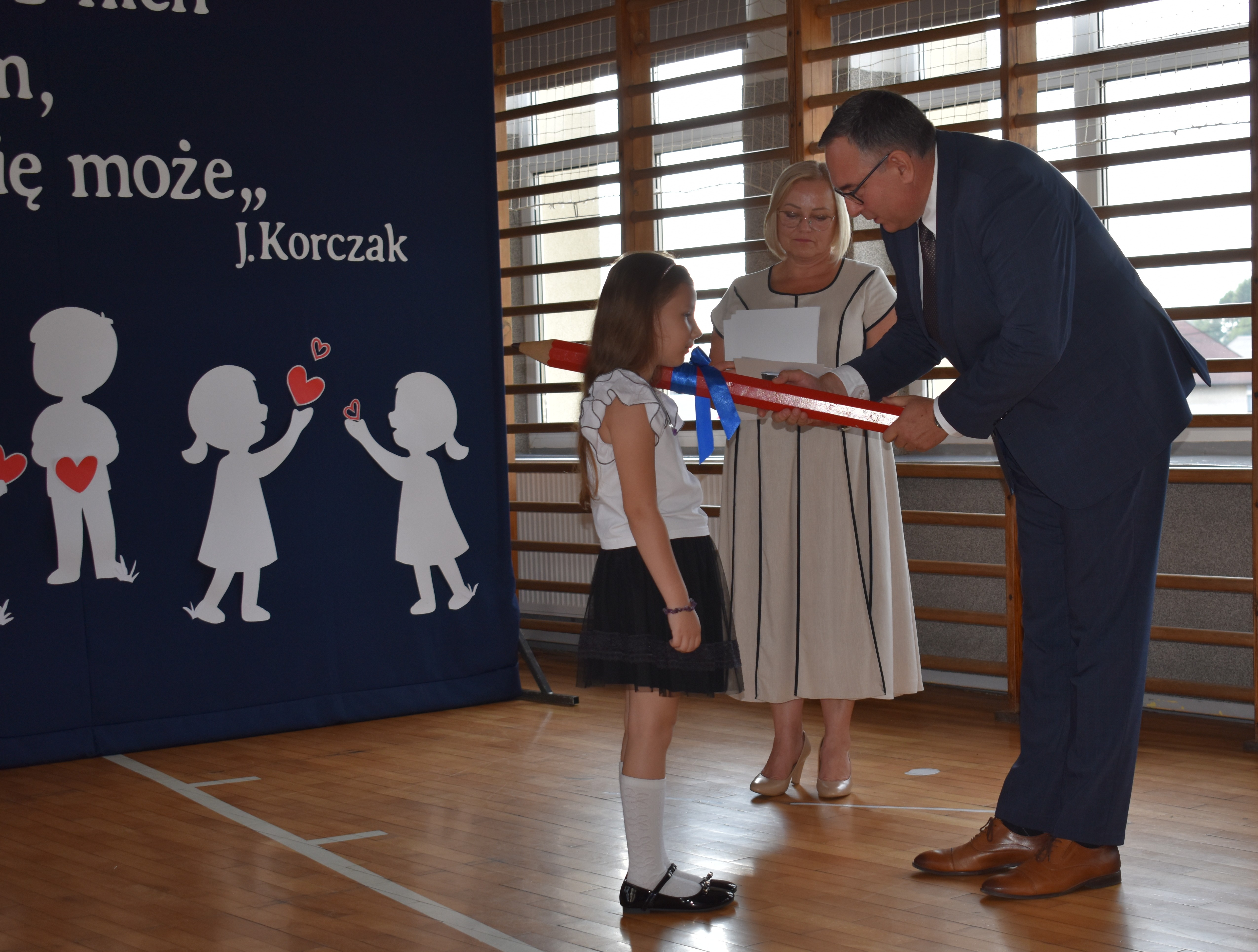 Szczególnie ciepłe słowa skierowane zostały do uczniów klasy pierwszej, którzy po raz pierwszy przekroczyli próg szkoły. W ich życiu rozpoczął się nowy, ważny etap. Z tej okazji odbyła się ceremonia pasowania na ucznia. Pierwszoklasiści, ubrani odświętnie i z lekką tremą, złożyli uroczyste ślubowanie, obiecując być pilnymi, uczciwymi i dobrymi kolegami. Następnie Pan dyrektor wielkim, symbolicznym ołówkiem pasował każde dziecko na ucznia szkoły.