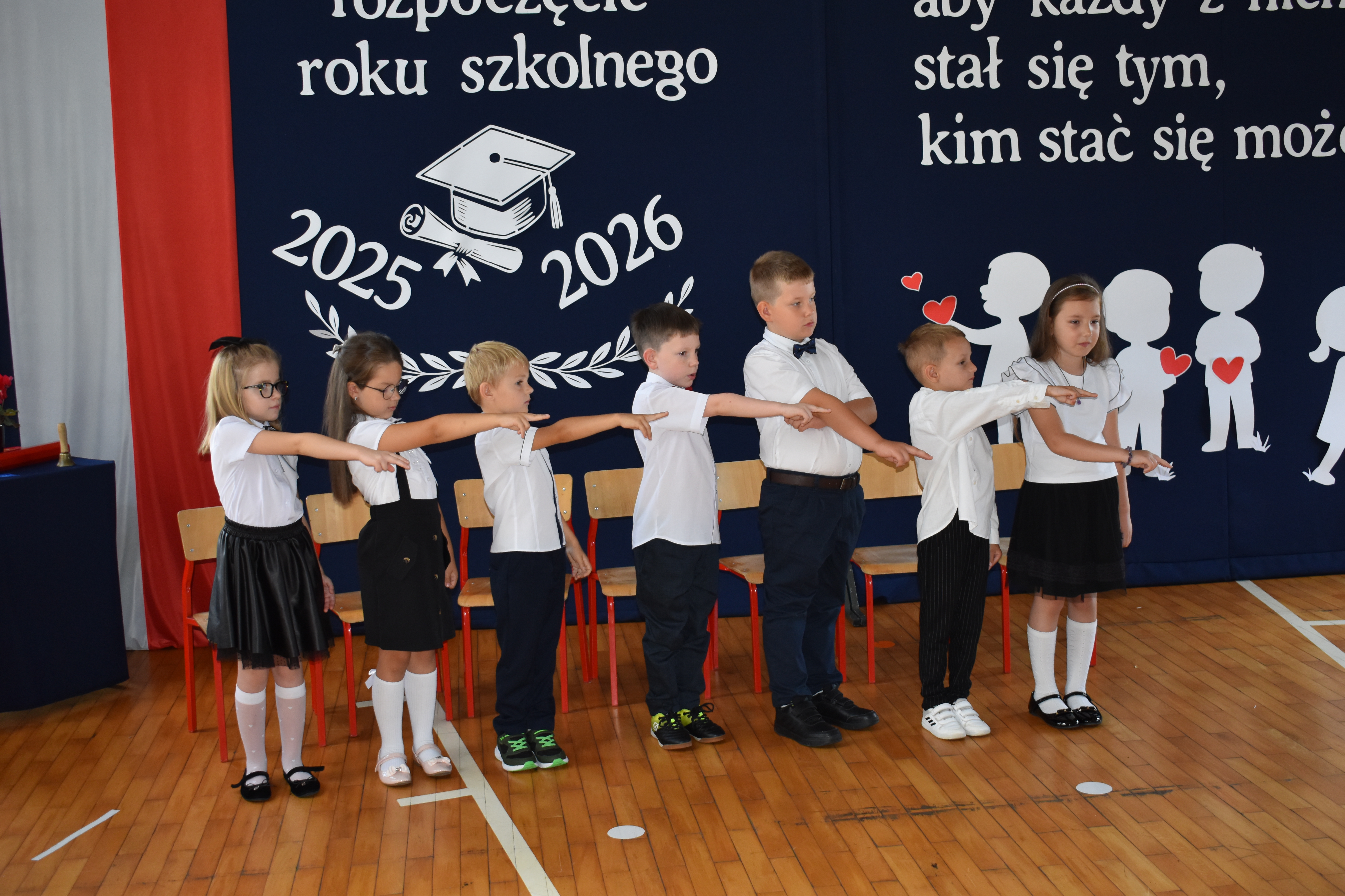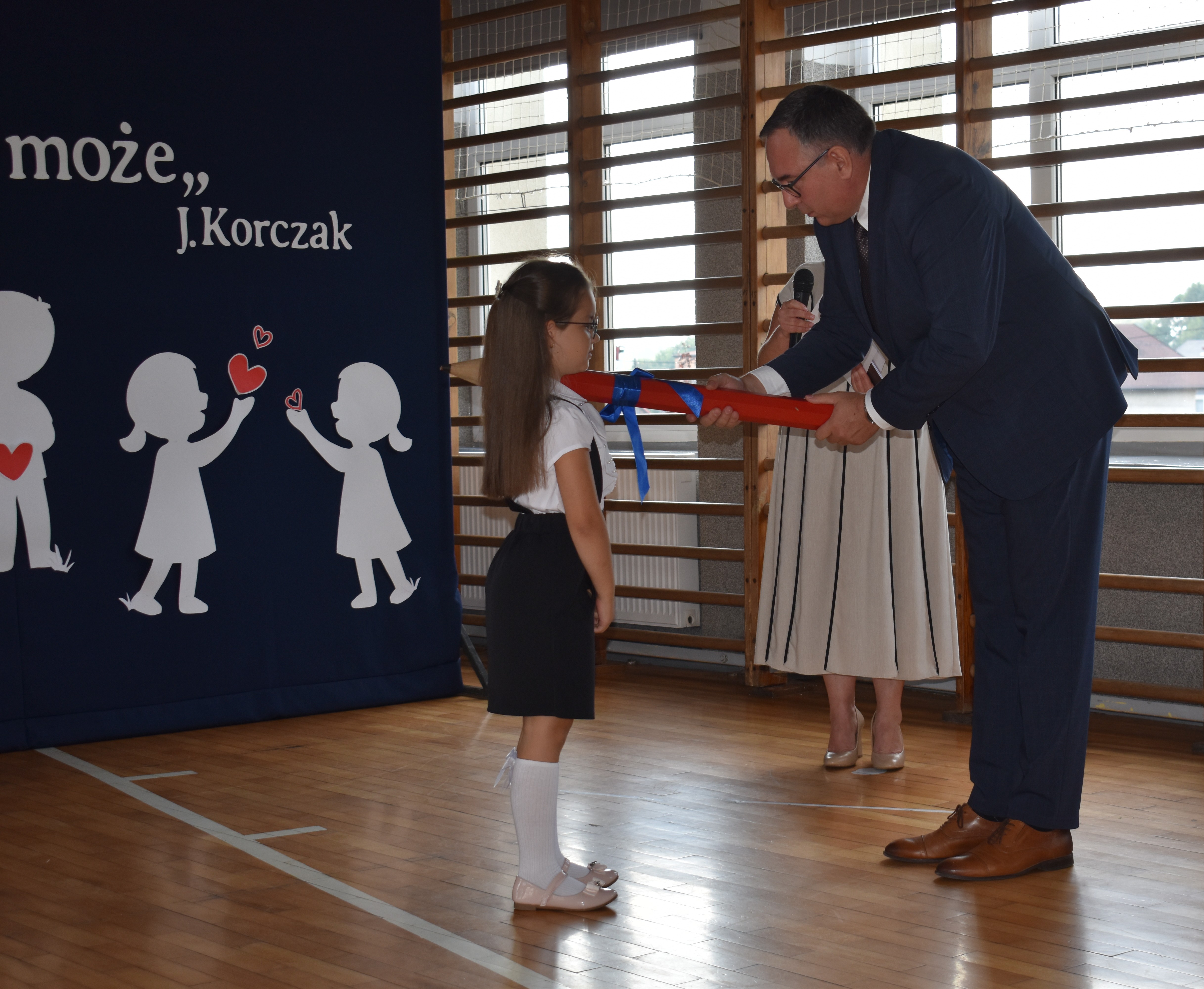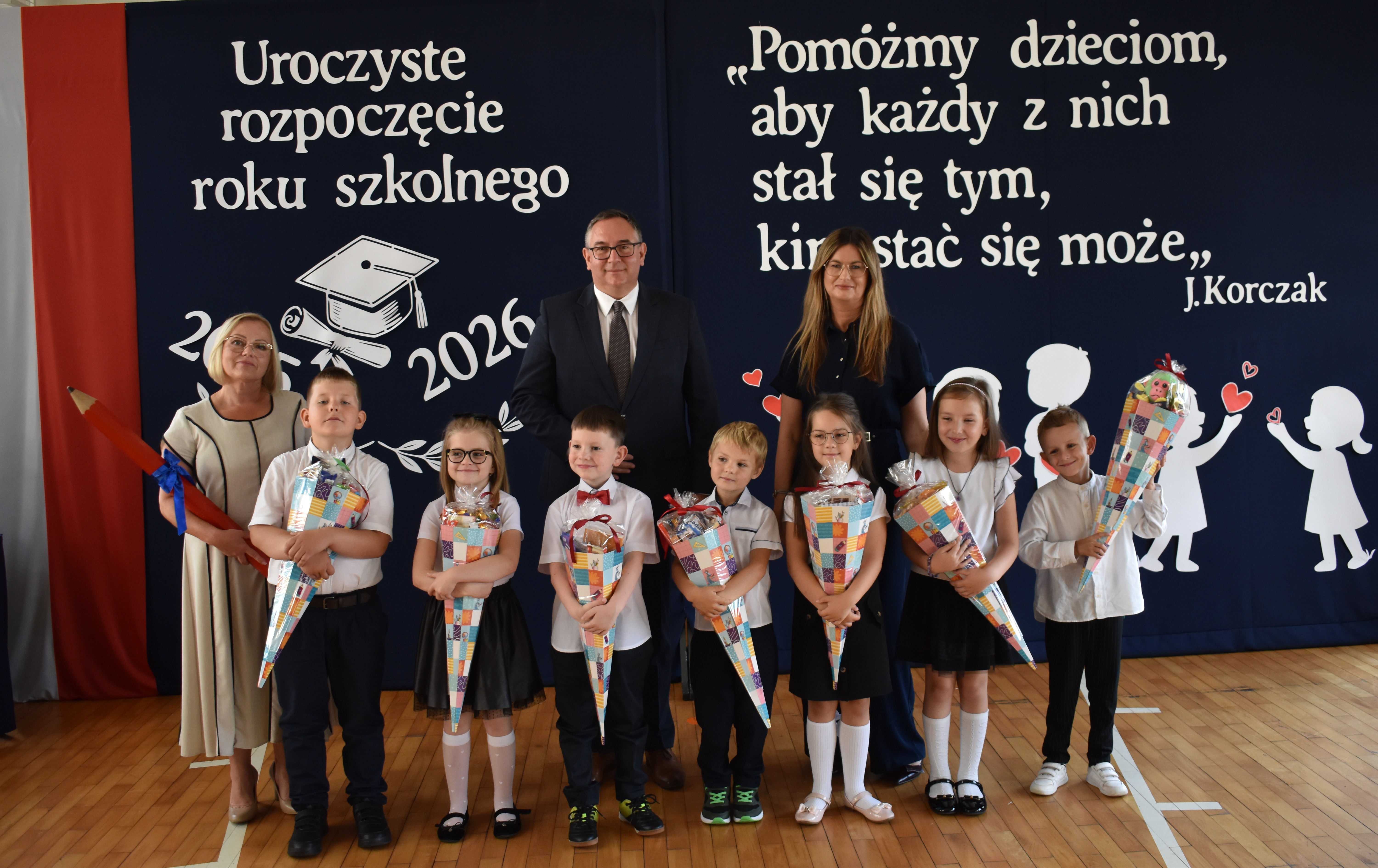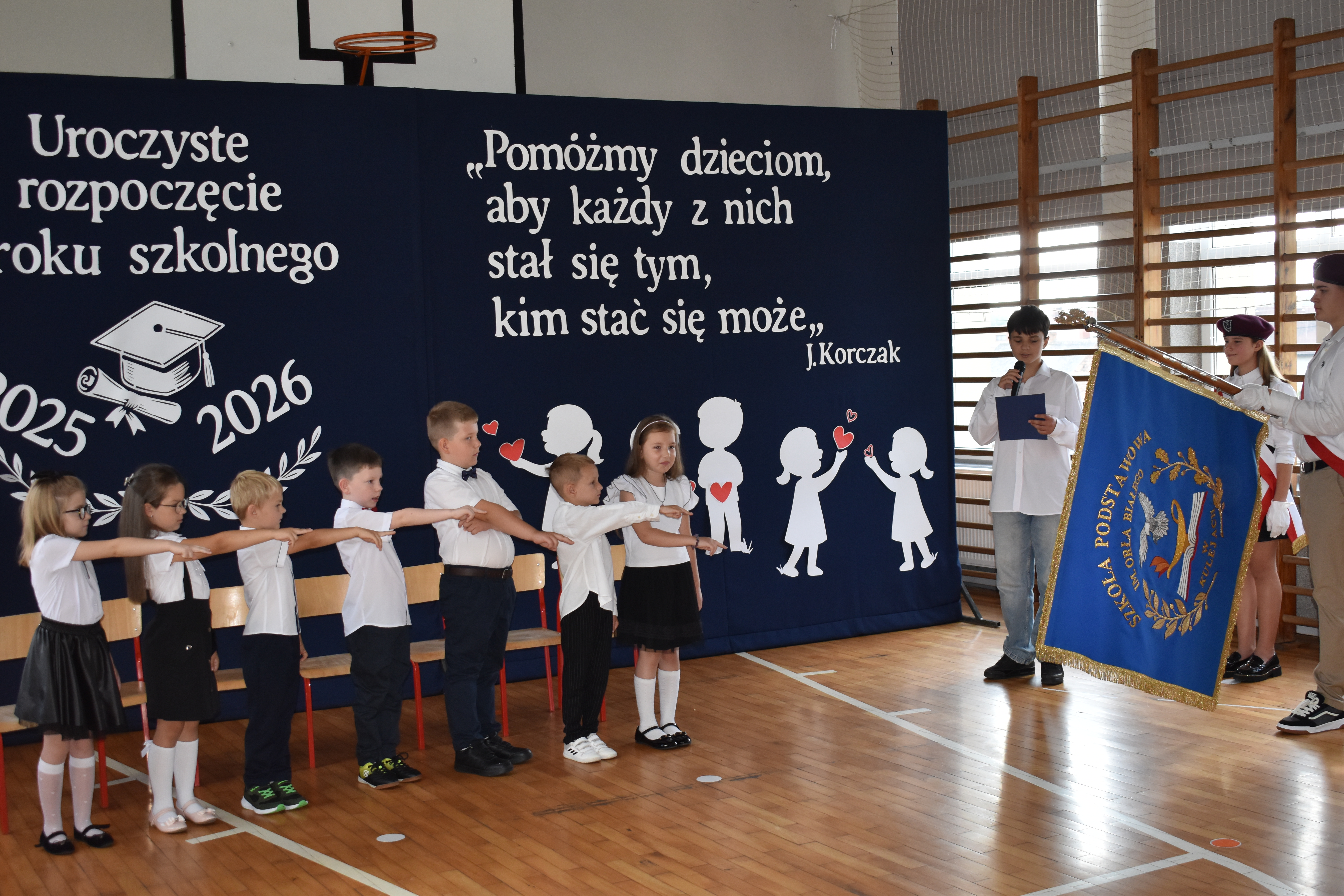 Szczególnie ciepłe słowa skierowane zostały do uczniów klasy pierwszej, którzy po raz pierwszy przekroczyli próg szkoły. W ich życiu rozpoczął się nowy, ważny etap. Z tej okazji odbyła się ceremonia pasowania na ucznia. Pierwszoklasiści, ubrani odświętnie i z lekką tremą, złożyli uroczyste ślubowanie, obiecując być pilnymi, uczciwymi i dobrymi kolegami. Następnie Pan dyrektor wielkim, symbolicznym ołówkiem pasował każde dziecko na ucznia szkoły.