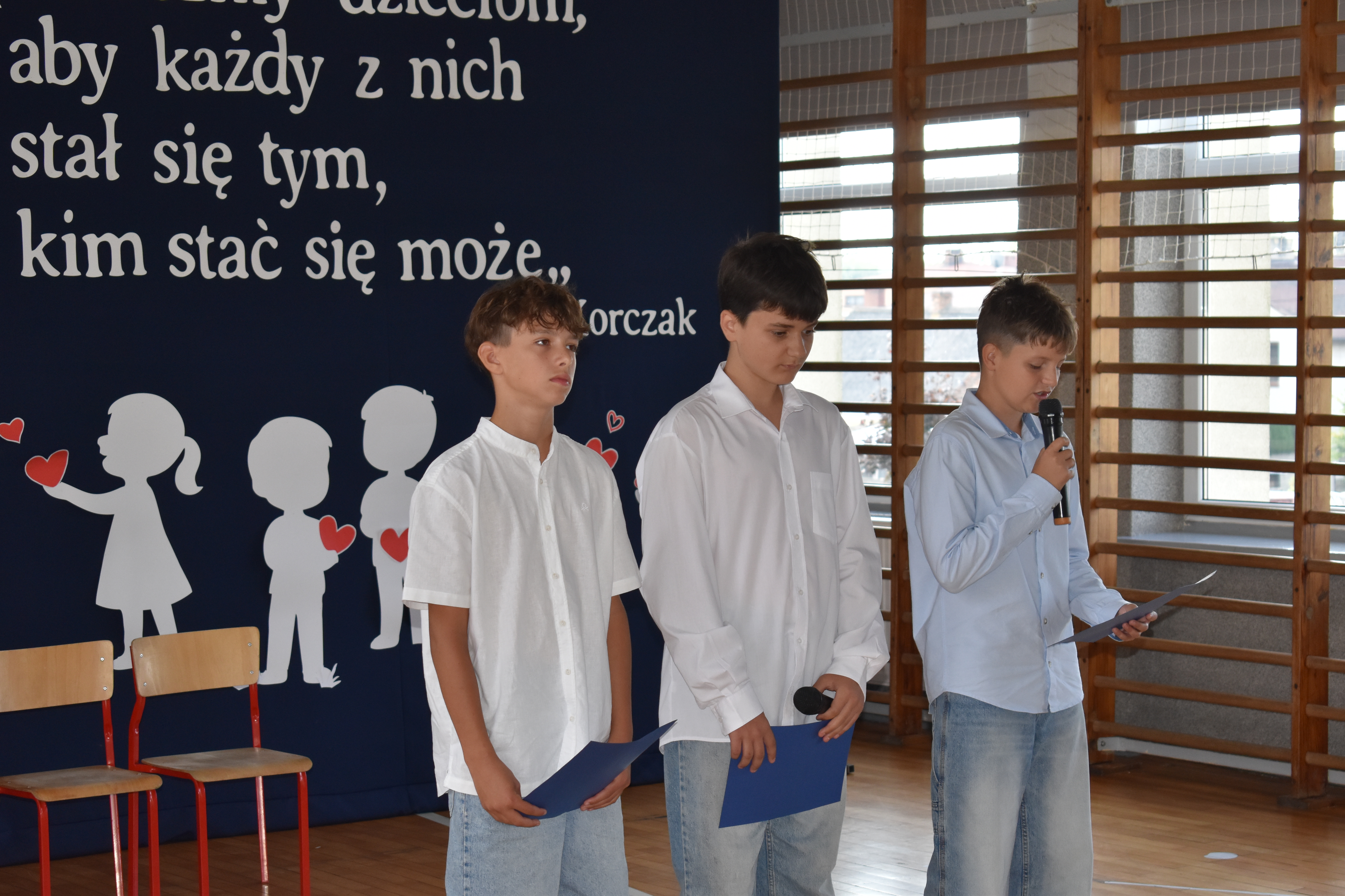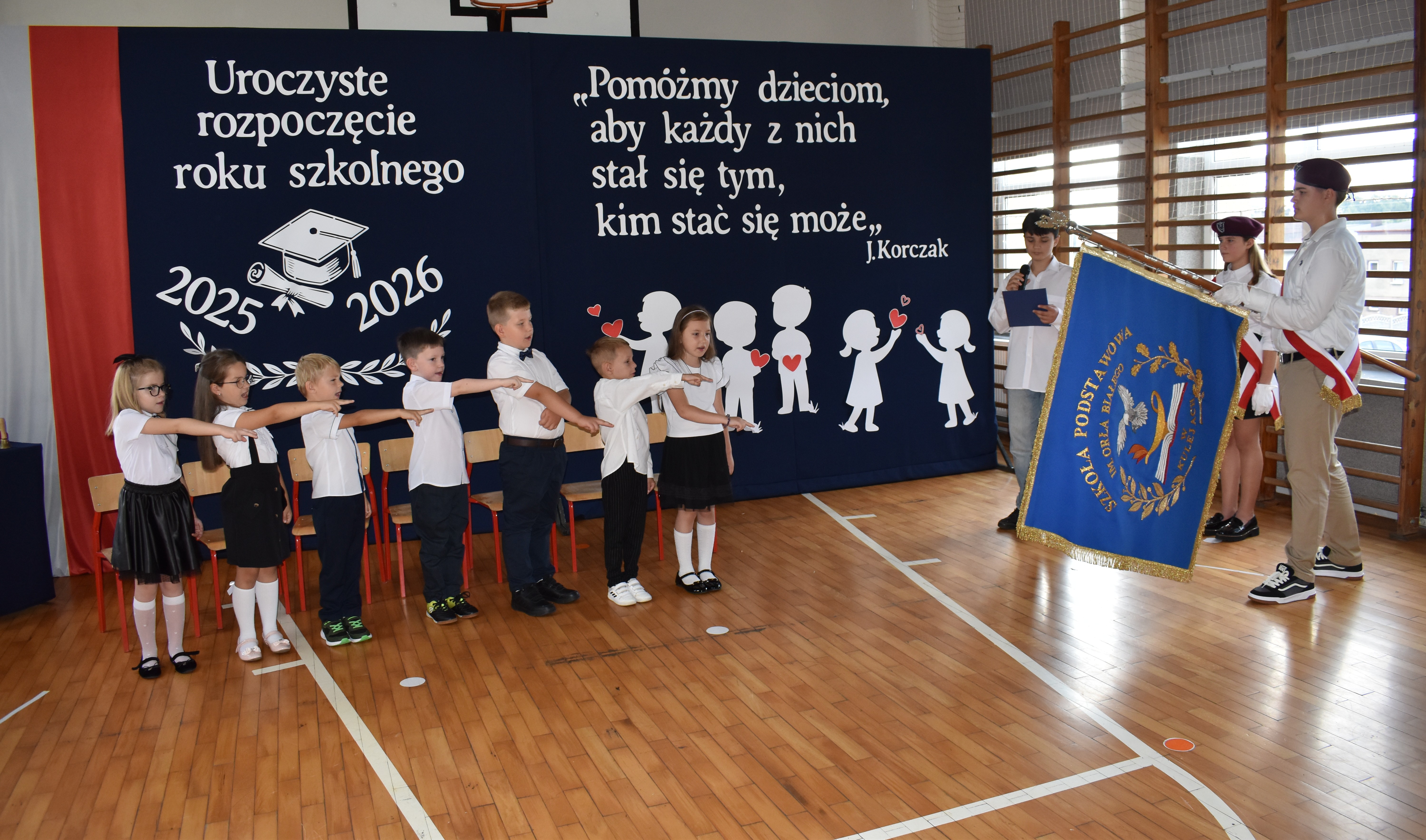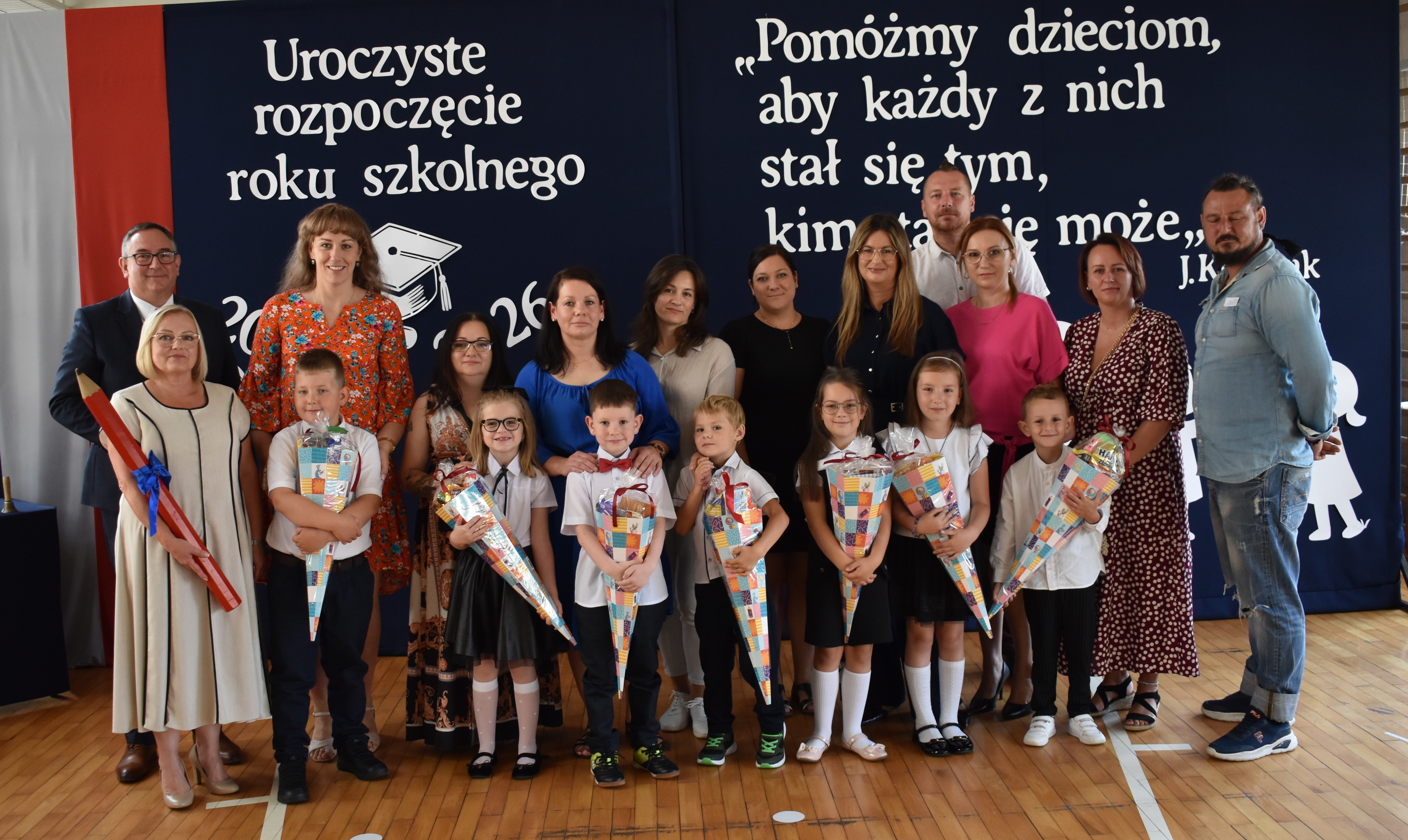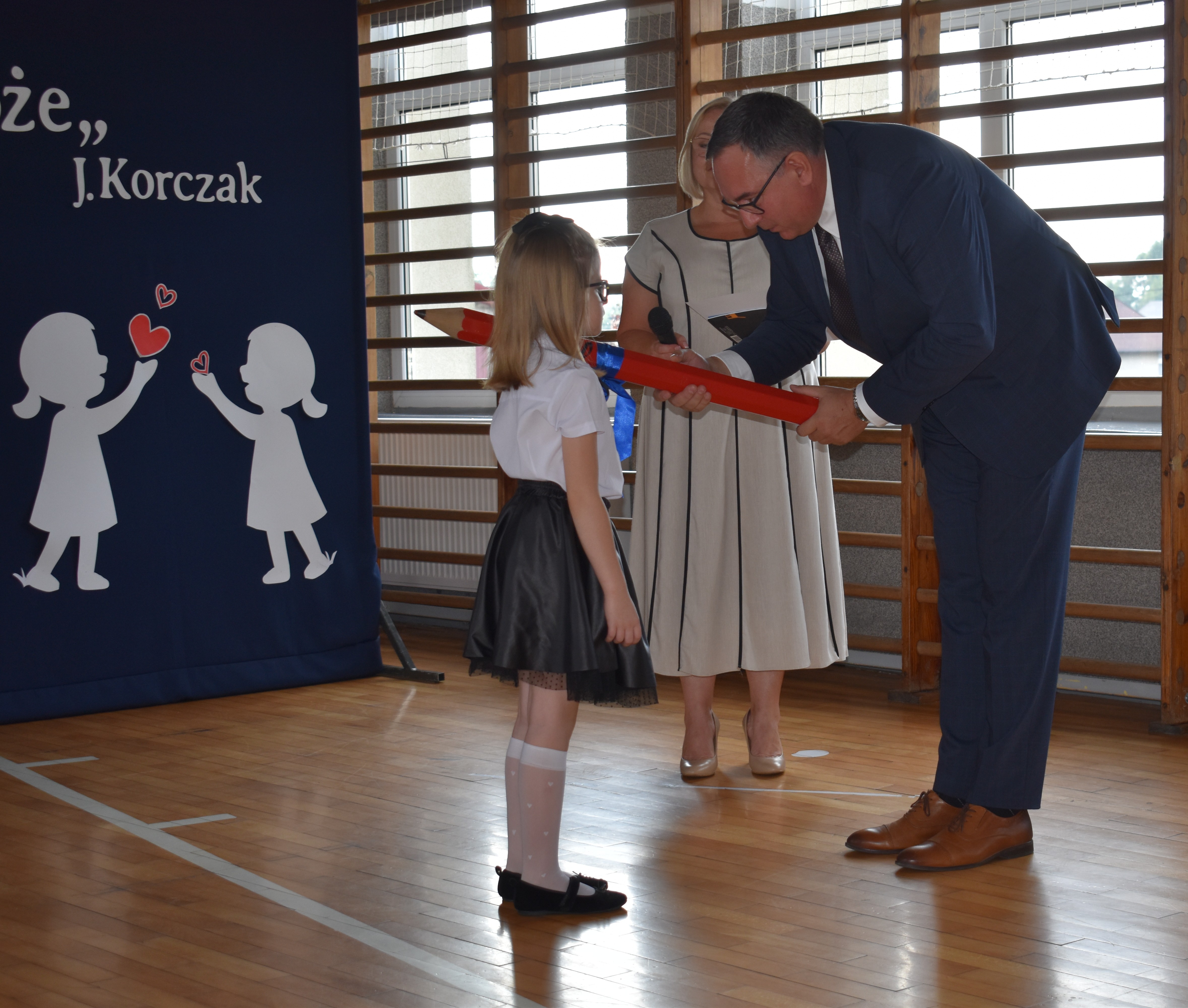 Szczególnie ciepłe słowa skierowane zostały do uczniów klasy pierwszej, którzy po raz pierwszy przekroczyli próg szkoły. W ich życiu rozpoczął się nowy, ważny etap. Z tej okazji odbyła się ceremonia pasowania na ucznia. Pierwszoklasiści, ubrani odświętnie i z lekką tremą, złożyli uroczyste ślubowanie, obiecując być pilnymi, uczciwymi i dobrymi kolegami. Następnie Pan dyrektor wielkim, symbolicznym ołówkiem pasował każde dziecko na ucznia szkoły.