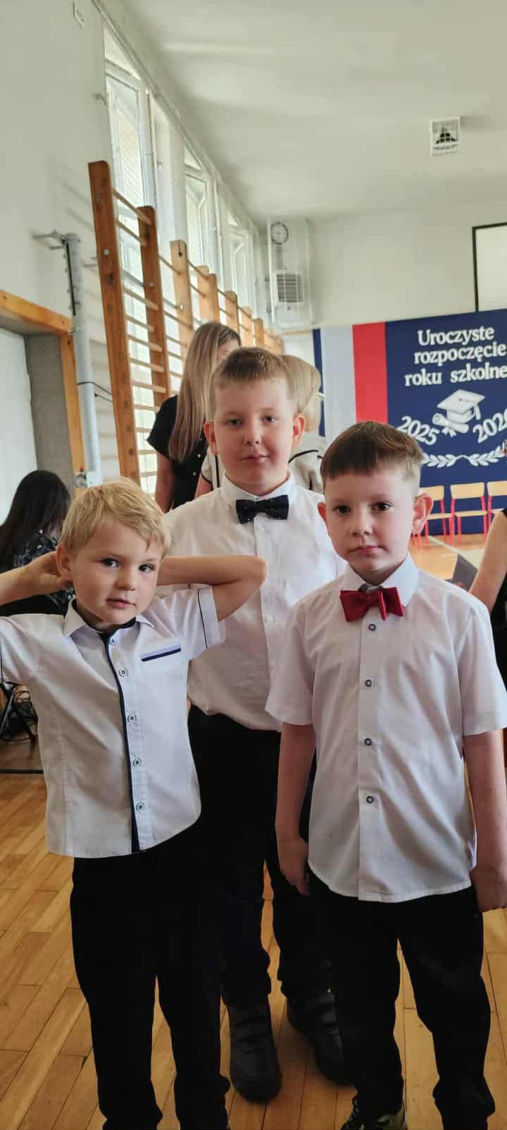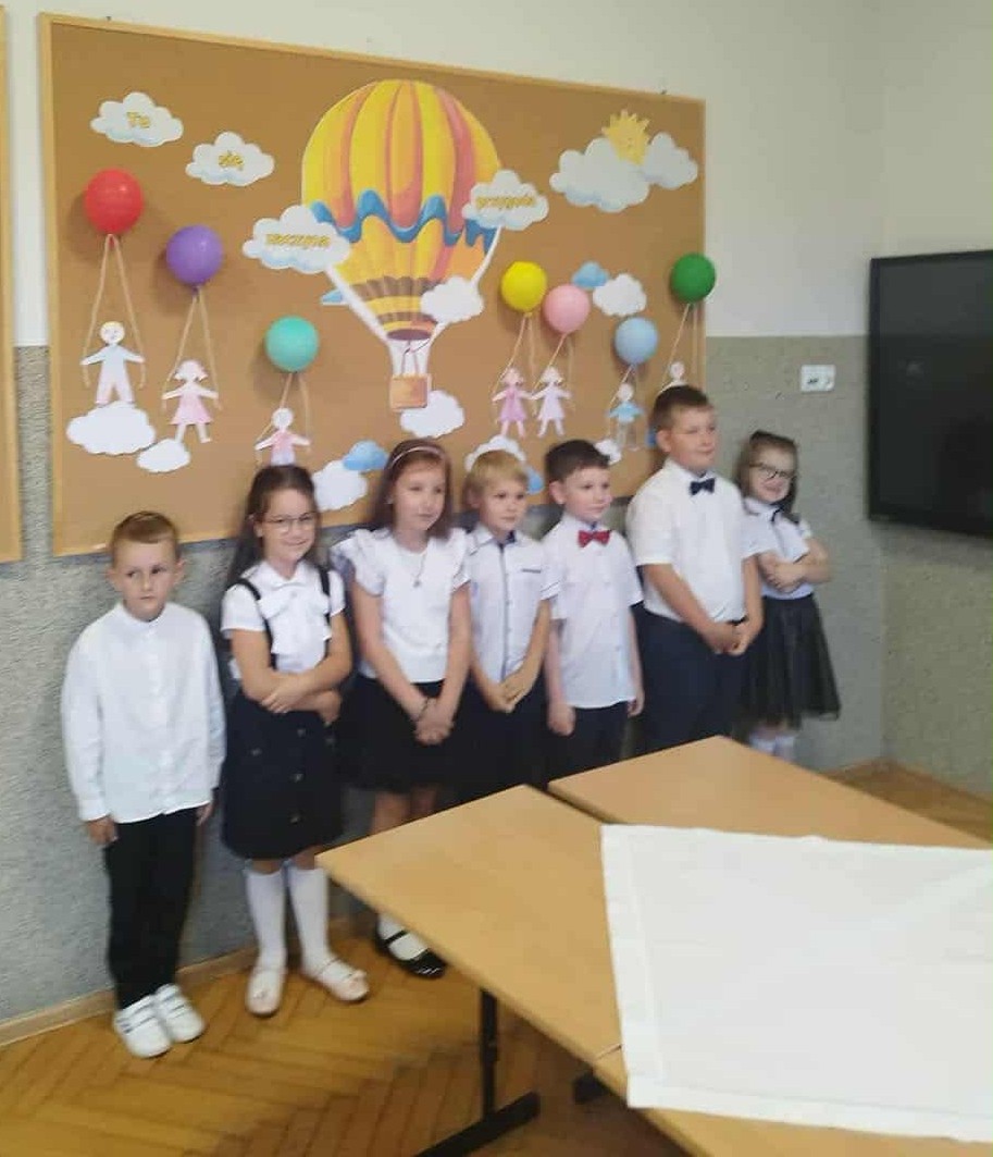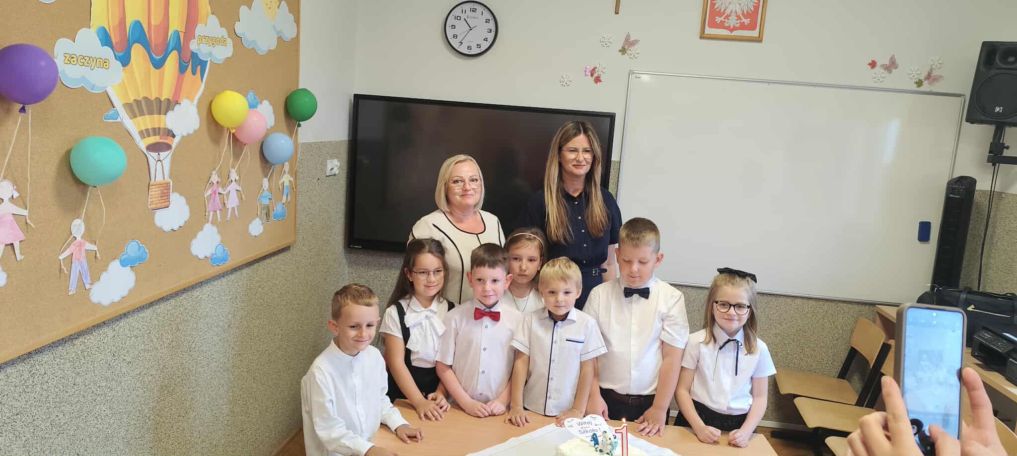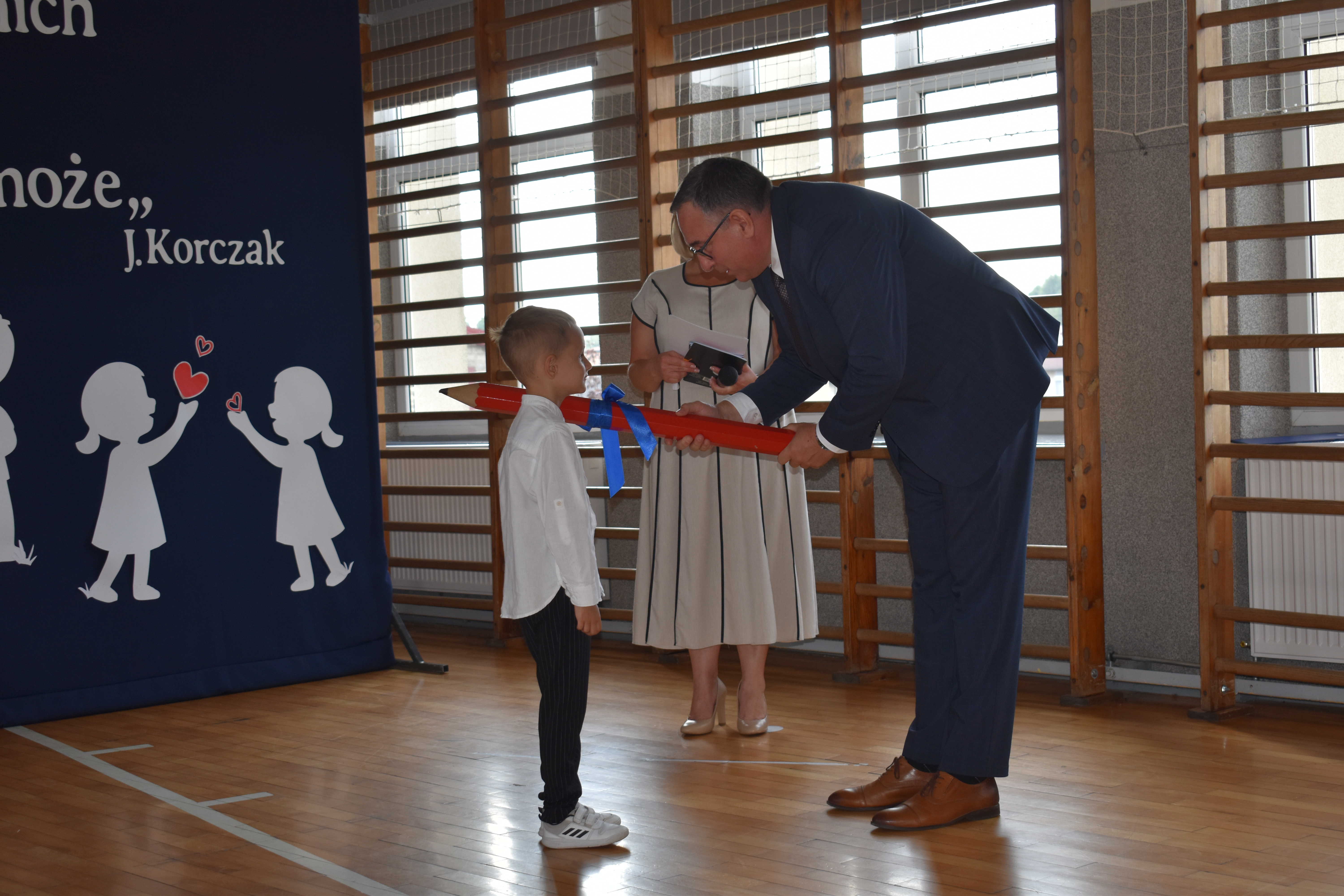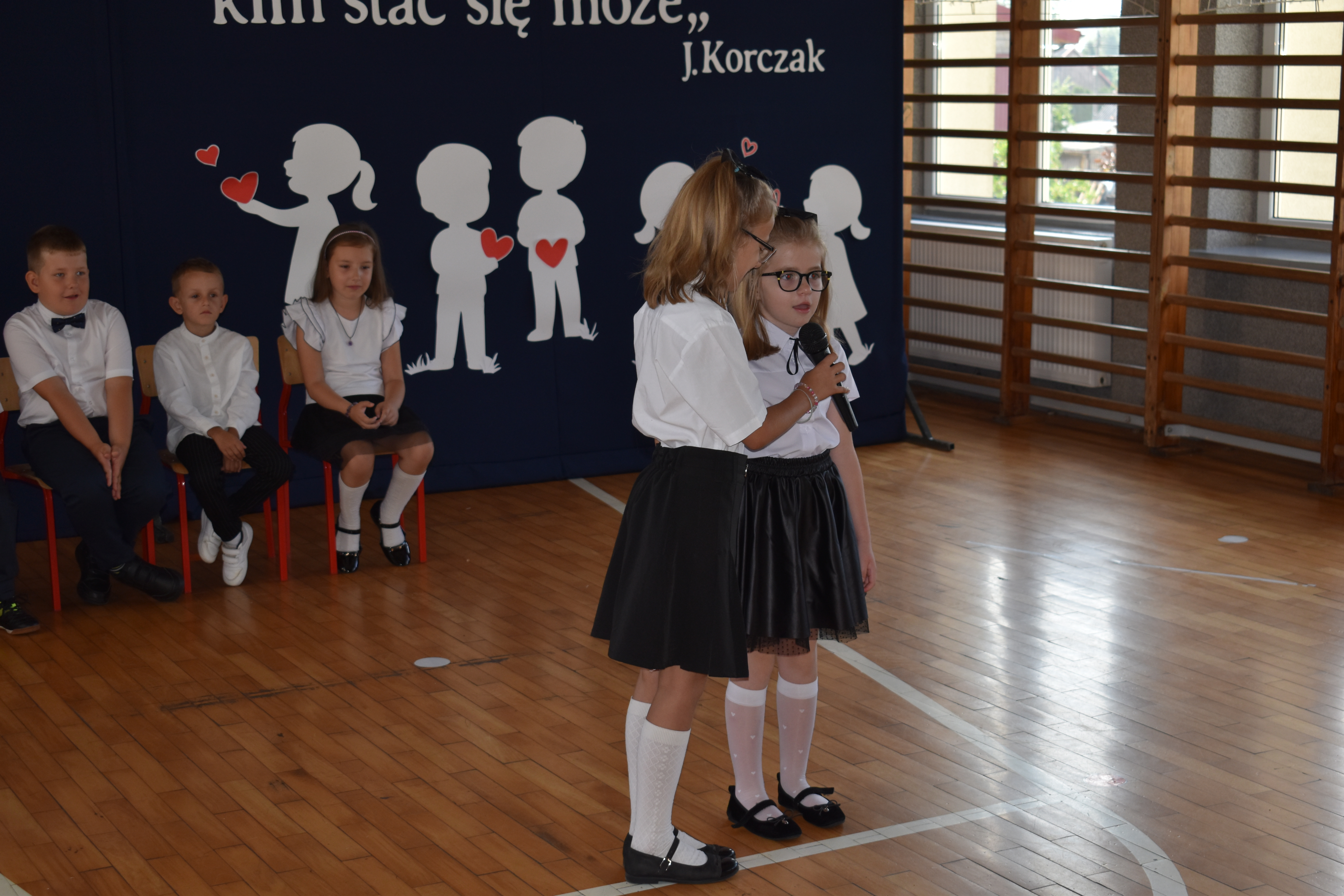 Szczególnie ciepłe słowa skierowane zostały do uczniów klasy pierwszej, którzy po raz pierwszy przekroczyli próg szkoły. W ich życiu rozpoczął się nowy, ważny etap. Z tej okazji odbyła się ceremonia pasowania na ucznia. Pierwszoklasiści, ubrani odświętnie i z lekką tremą, złożyli uroczyste ślubowanie, obiecując być pilnymi, uczciwymi i dobrymi kolegami. Następnie Pan dyrektor wielkim, symbolicznym ołówkiem pasował każde dziecko na ucznia szkoły.