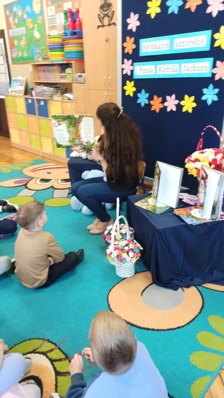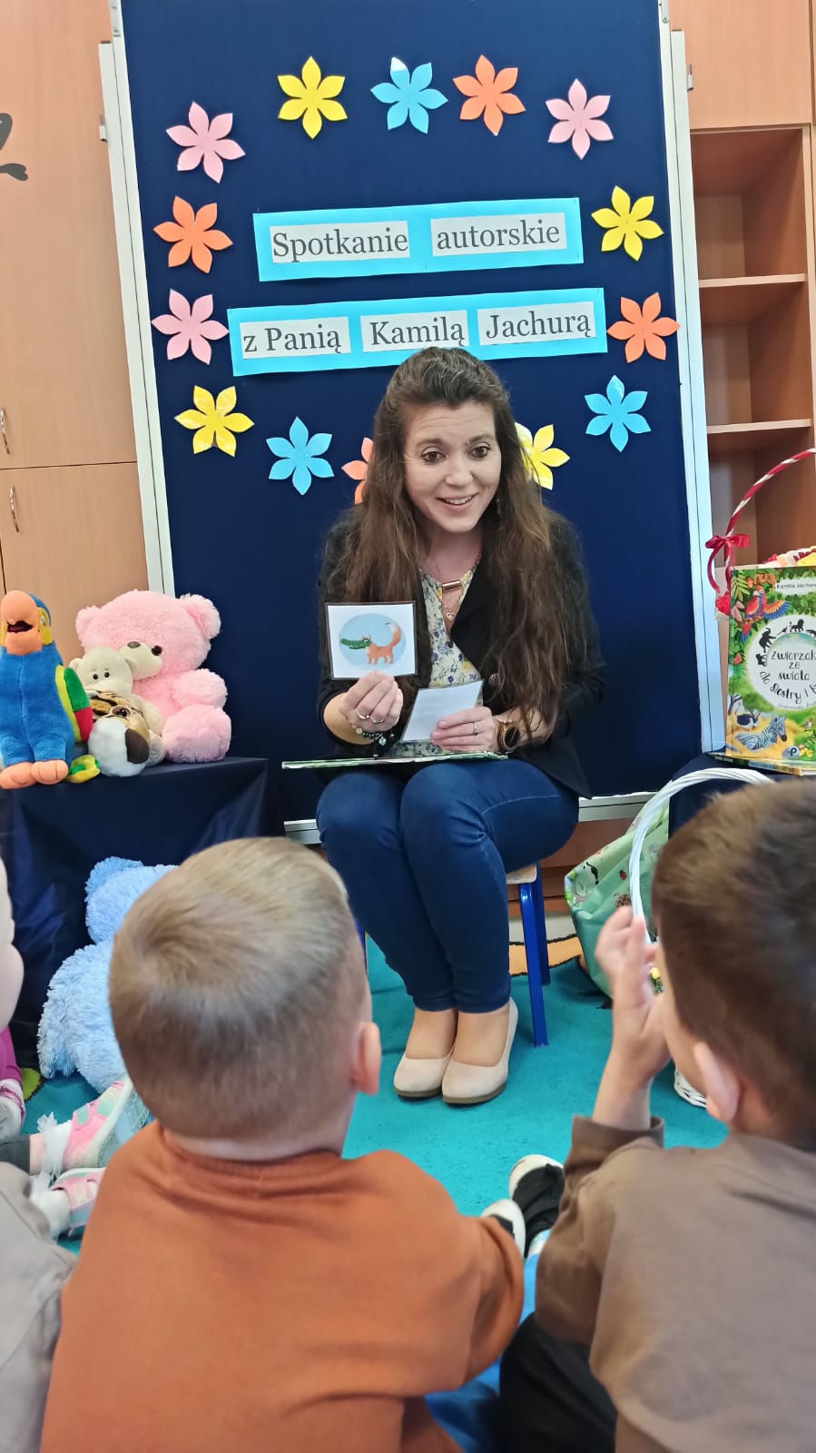W ramach Narodowego Programu Rozwoju Czytelnictwa odbyło się spotkanie autorskie z Panią Kamilą Jachurą, która jest autorką książek dla dzieci. Przedszkolaki z zachwytem wysłuchały opowieści o zwierzętach i ich przygodach, odpowiadały na zagadki, bawiły się w "Zajączka" oraz wykonały pracę plastyczną.