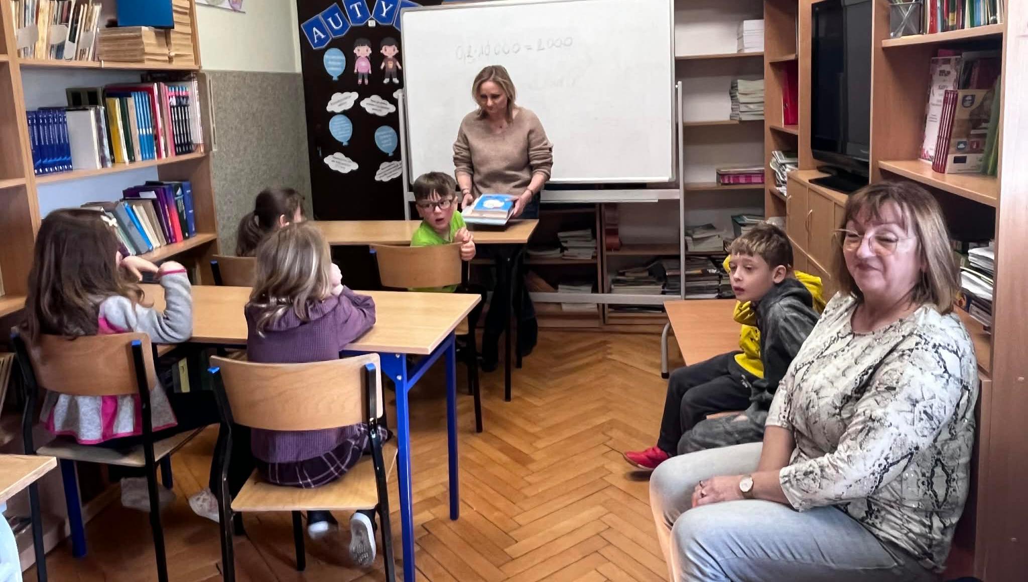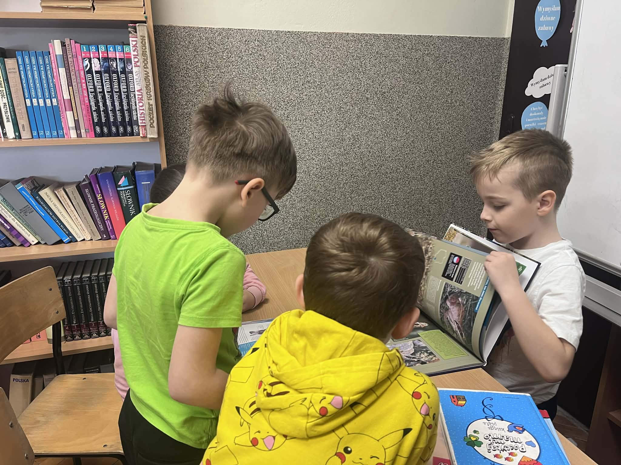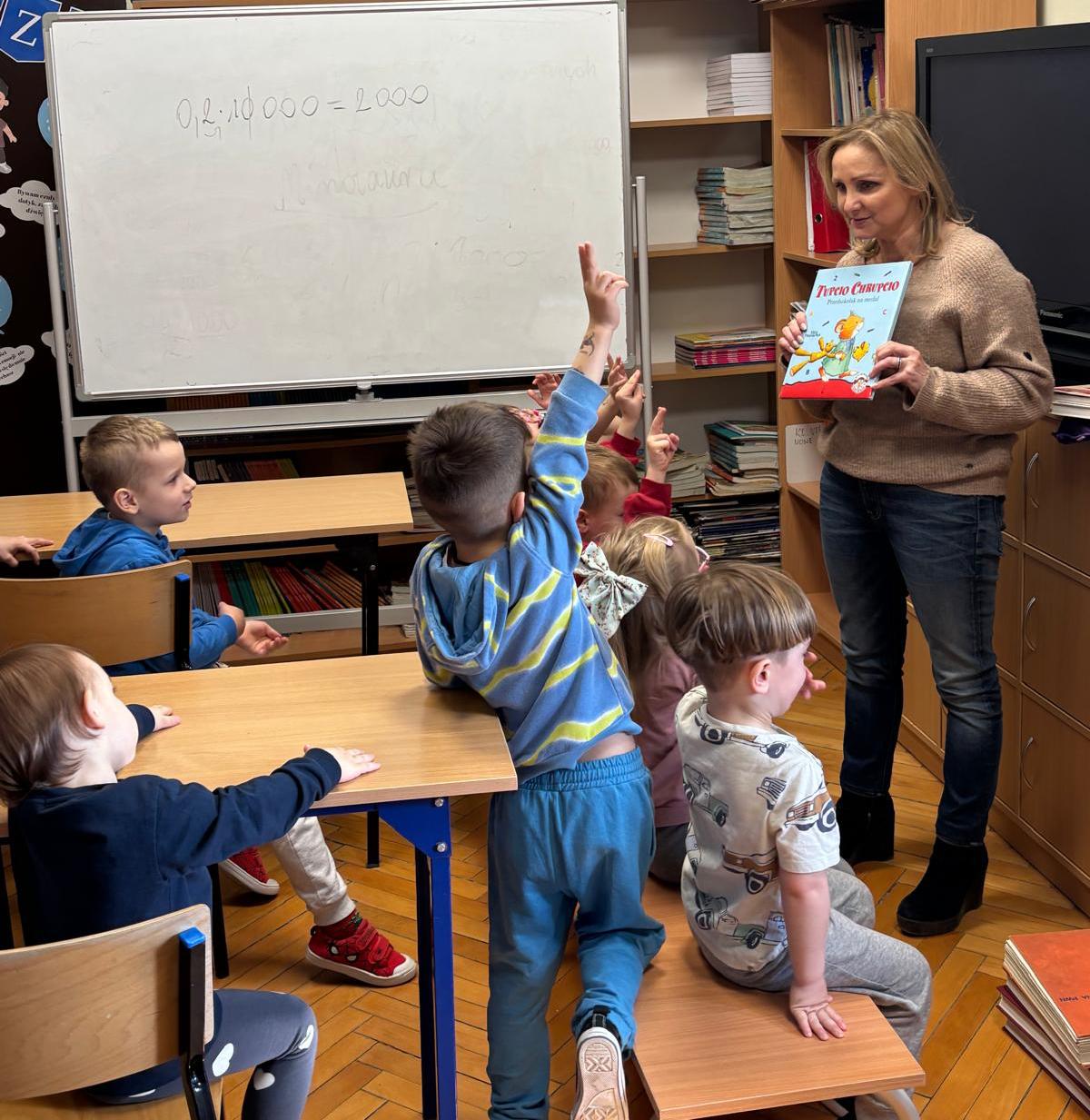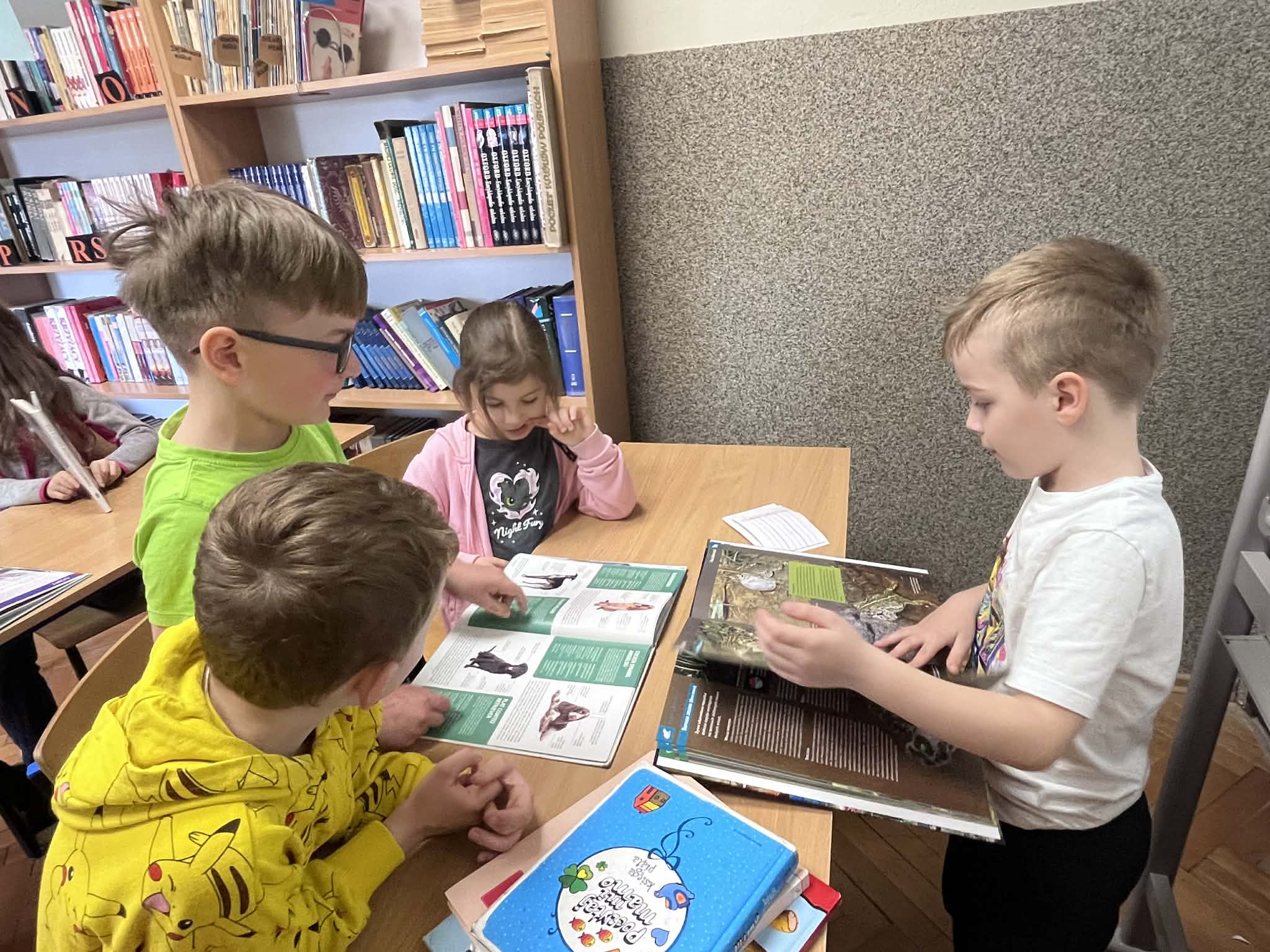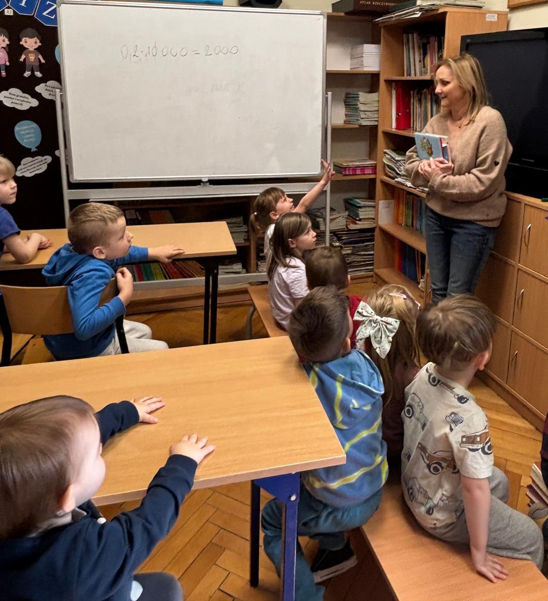 10 kwietnia dzieci przedszkolne wzięły udział w spotkaniu z Panią Edytą Przybylską- bibliotekarką, która zachęcała wszystkich do częstego czytania z najbliższymi. Celem spotkania było zapoznanie z zawodem bibliotekarza, rozbudzenie zainteresowania książkami, wyjaśnienie pojęć: książka, okładka, pisarz, grafik, drukarnia, biblioteka. Dzieci z wielkim zainteresowaniem oglądały prezentowane książki, odpowiadały na pytania dotyczące w jaki sposób trzeba dbać o książki oraz jakich zachowań należy się wystrzegać podczas czytania.