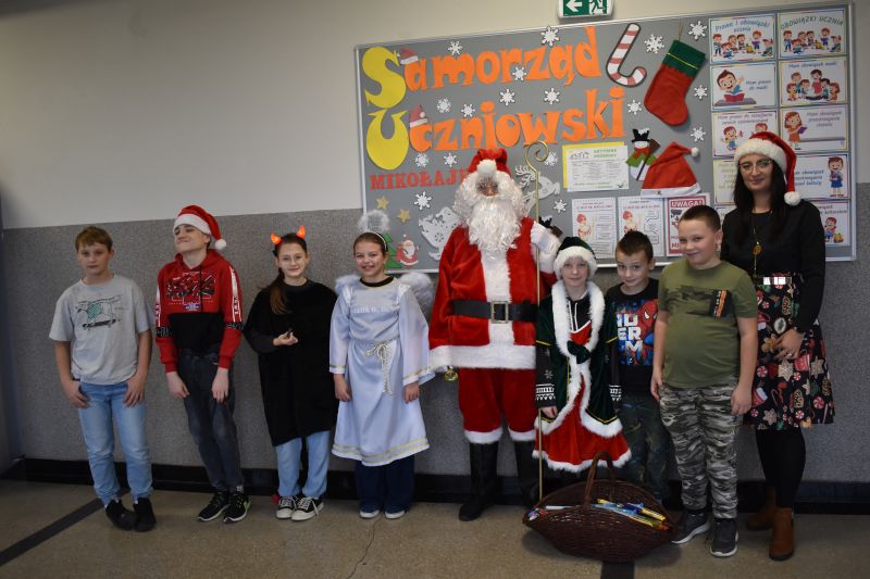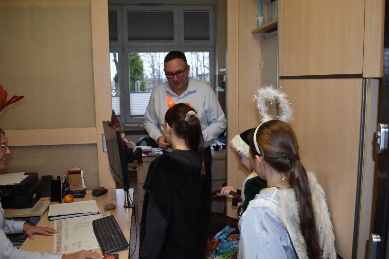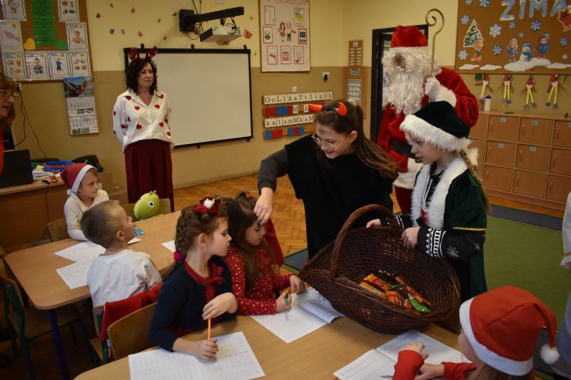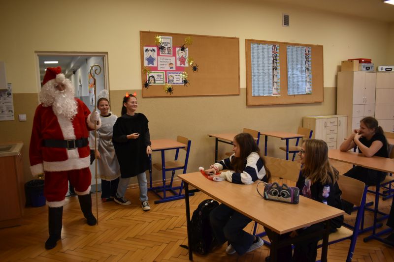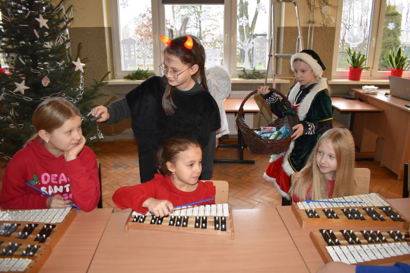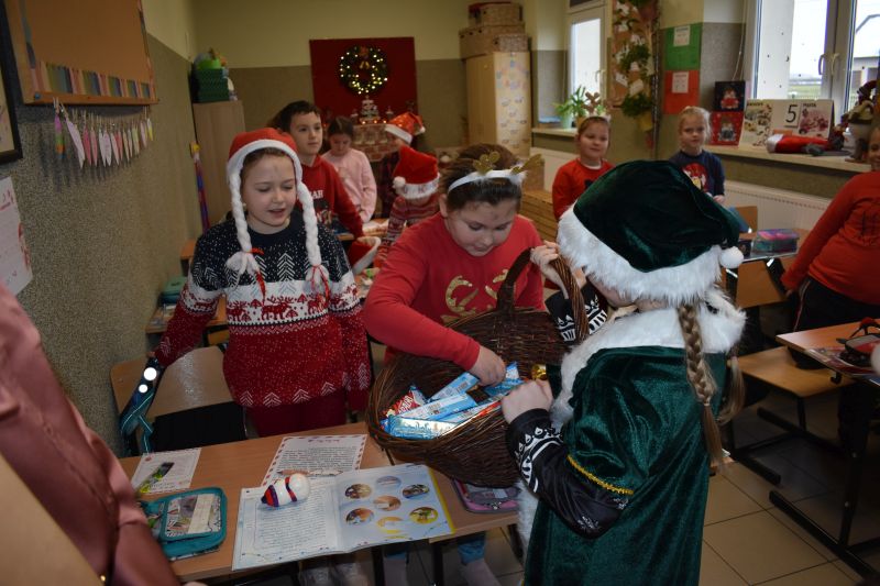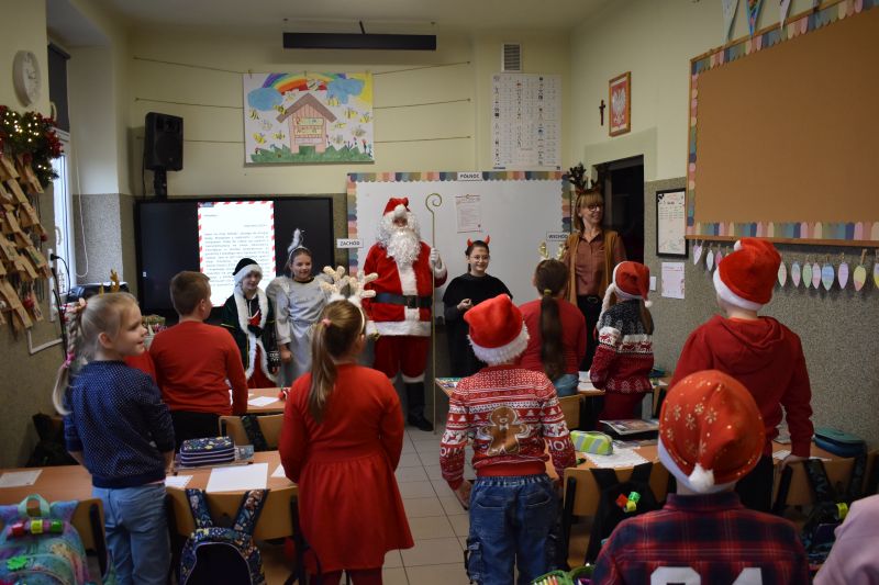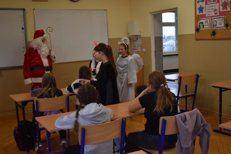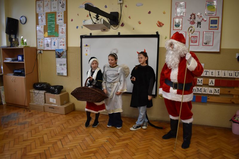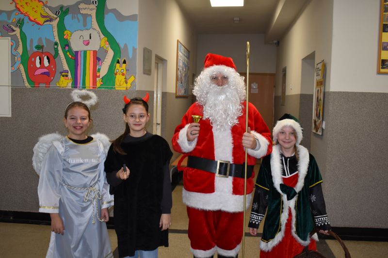 Grzeczne pociechy – zarówno te najmłodsze, jak i starsi uczniowie – w nagrodę za swoje wzorowe zachowanie zostały obdarowane słodkim upominkiem. Natomiast wszystkie łobuzy zostały naznaczone przez Diabełka — na ich policzkach pozostawił ślady węgla na znak, że muszą się poprawić!