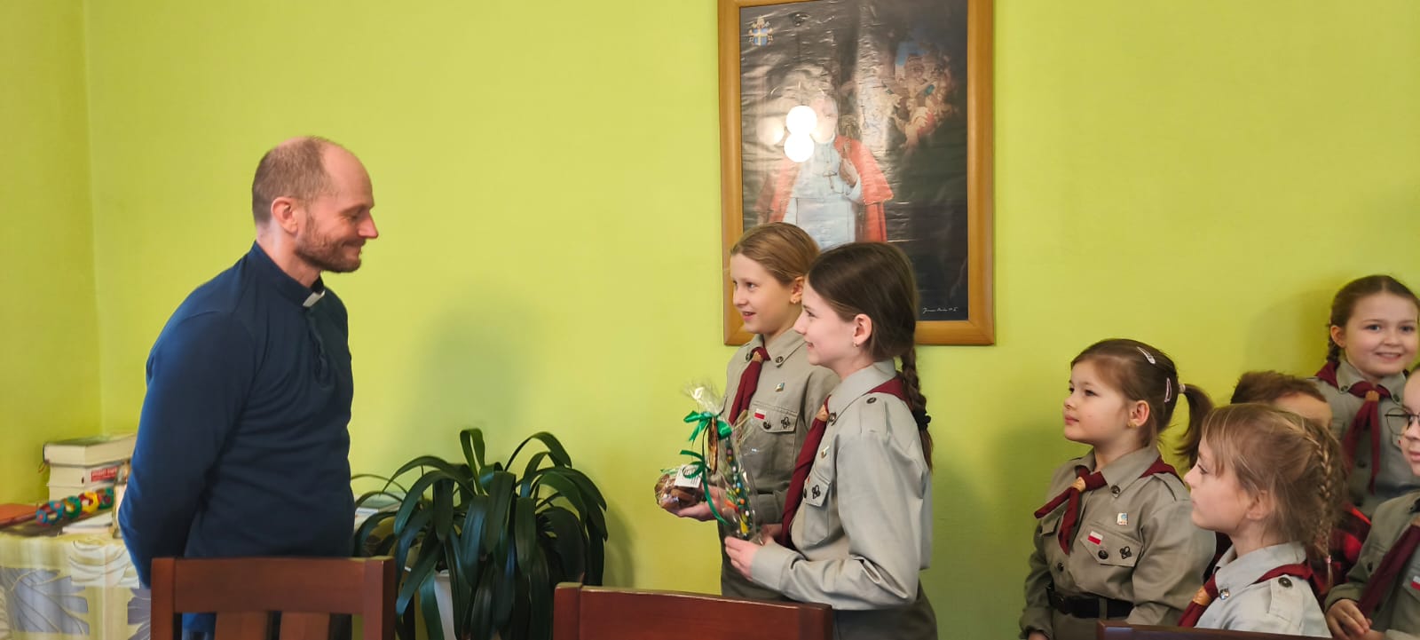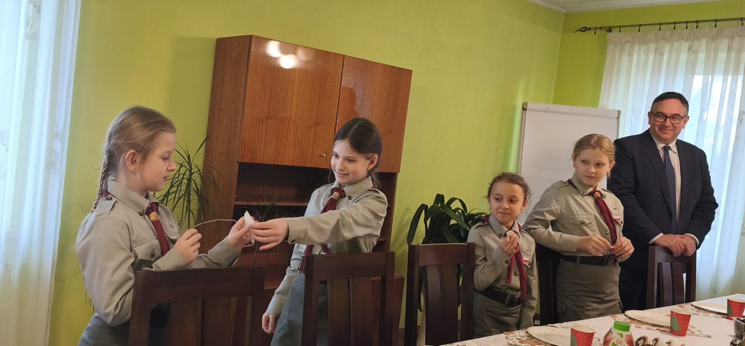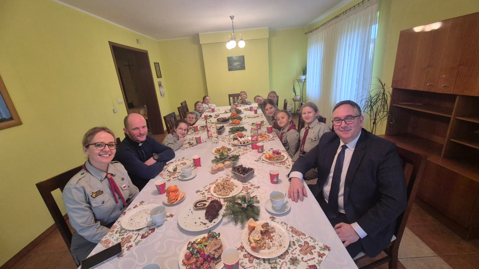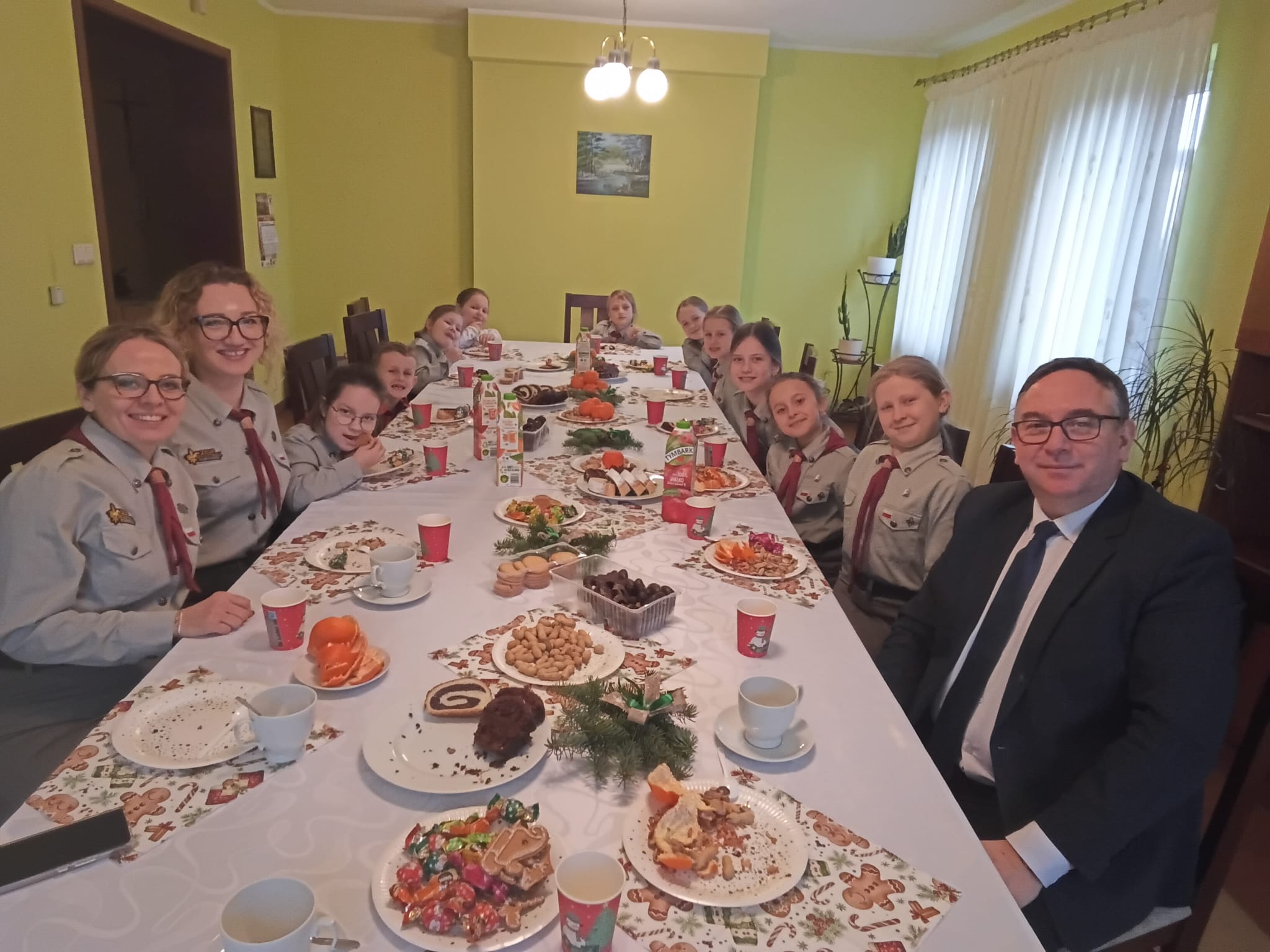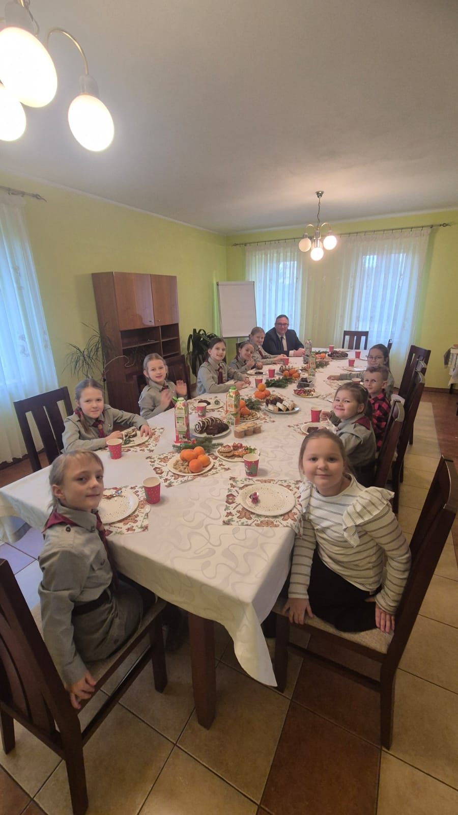 Wigilia zuchowa to jedno z najbardziej wyczekiwanych wydarzeń w życiu każdego zucha. To czas pełen radości i wspólnego dzielenia się opłatkiem oraz świątecznymi tradycjami. W tym roku Wigilię zorganizowaliśmy wspólnie z proboszczem parafii Kuleje. Na nasze spotkanie opłatkowe zaprosiliśmy także Dyrektora Szkoły Podstawowej im. Orła Białego w Kulejach - Macieja Cichopka, który obdarował zuchy drobnymi słodkościami i włączył się do wspólnego kolędowania.